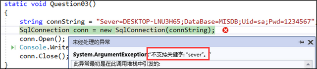 前言前面已经给大家总结了一些关于数据库的问题,基本上大家遇到的数据库问题,都能从下面的文章中找到答案,希望大家可以收藏一下,遇到问题,可以一一对照去查找原因。 数据库系列之特定实例错误 数据库系列之sa账户登录失败 数据库系列之常见语法错误 数据库系列之App.config配置文件错误 其实,大家在学习数据库的时候,可能还会遇到各种奇奇怪怪的问题,今天我们针对这些零散的问题,做一下具体的分析。 希望可以为大家学习数据库铺平道路。 常见错误1错误提示:不支持关键字“sever”。 《C#程序》的错误提示: 【问题分析】:只要是在连接对象创建中,提示“不支持关键字的”,就是这个关键字写错了。 解决方案仔细核对就行了。比如上面的,就是把Server写成了sever,常见的其他的还有把DataBase写成DateBase等。这个要求你必须认真检查,改正后,错误就解决了。 常见错误2错误提示:ConnectionString属性尚未初始化。