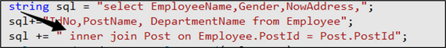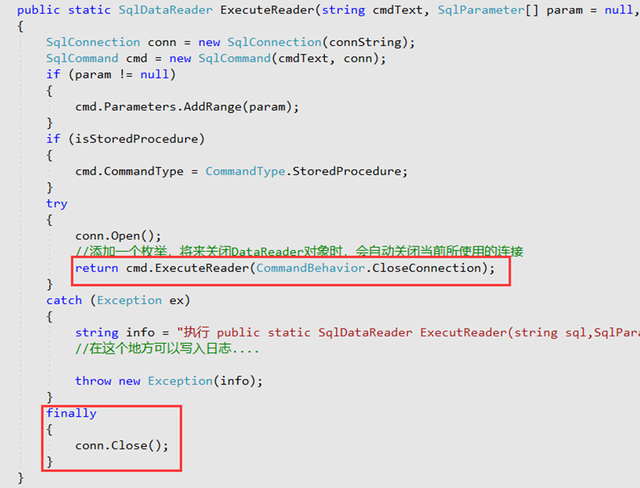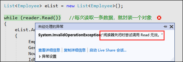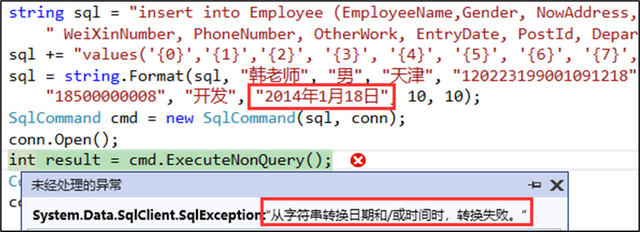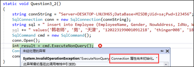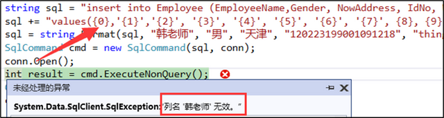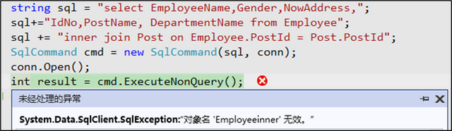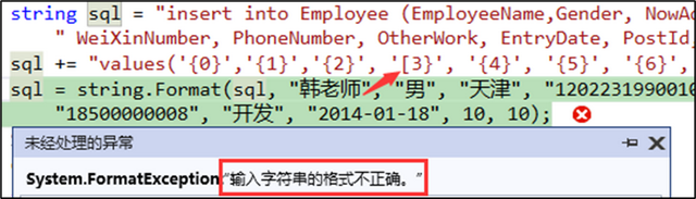 解决方案这种错误很容易解决,就是new 连接对象的时候,忘记把连接字符串放进去了,按照如下改正即可: 常见错误3错误提示:Connection属性尚未初始化。 《C#程序》的错误提示: 【问题分析】此问题和上面的问题有些类似,都是属性尚未初始化,但是这里的问题是指Connection,这个是连接对象,而上面的是连接字符串ConnectionString,所以问题解决方式一样,但是位置不一样。Connection对象属性未初始化问题是因为SqlCommand构造的时候,没有传递进去。 解决方案所以按照如下修改即可: 常见错误4错误提示:列名“EmployeName”无效。 《C#程序》的错误提示: 解决方案主要提示列名无效的,请检查提示的这个列名称是不是真的写错了,也就是从SQL语句中去直接查看(这个不要调试,直接看就可以),如果真的写错了,就修改,比如上面的EmployeeName确实写成了EmployeName,也就是少了一个e,所以提示错误。主要改过来就行了。 常见错误5错误提示:列名“韩老师”无效。 《C#程序》的错误提示: 解决方案都是同样的错误告诉我们列名无效,但是现在这个列并不是真实的列名称,而是我们给列对应的一个值,这种情况,通常是使用格式化的SQL语句时,需要添加单引号的占位符,却没有添加造成的,很明显第一个占位符 {0} 因为是字符串类型,必须添加单引号,添加后,错误就没有了。 常见错误6错误提示:对象名“Employeeinner”无效。 《C#程序》的错误提示: 解决方案其实本错误如果细心的话,是可以直接看出来的,C#中把数据库中的表,也称为对象,所以这里说的对象名无效,也就是说表的名称无效,而在查询语句中,我们用的表是Employee,这里很显然后面多了inner,也就是说inner和Employee直接缺少的空格,所以加上空格问题就马上解决。 常见错误7错误提示:从字符串转换日期和/或时间时,转换失败。 《C#程序》的错误提示: 解决方案反射调试日期或时间,转换无效的,我们就直接定位到“日期”字段对应的值,在SQLServer里面对日期的格式要求非常严格,我们常用的日期格式为“2022-01-01或2022/02/02”,(但是也有其他格式,但是不推荐)所以,带着汉字的“年月日”这种格式肯定是不行的,有时候,有的学员可能也会用到,带着“星期”的日期,这种都是不符合规范的。所以上面的问题解决,就是直接把“2014年1月18日”这种日期格式改成“2014-01-18”就可以了。 常见错误8错误提示:输入的字符串格式不正确。 《C#程序》的错误提示: 解决方案这种错误出现的位置和前面的统称都不一样,是在字符串格式的位置出现的,所以,我们重点观察占位符,如果仔细观察的话,会发现,在占位3个位置,把花括号写成了中括号,从而导致这个错误,这种错误希望大家能记住排查问题的要点,归根结底还是要仔细。 常见错误9错误提示:输入的字符串格式不正确。 《C#程序》的错误提示: 【问题分析】:在我们学习DataReader对象的时候,其实重点强调了DataReader对象在数据没有读取完毕之前,是不能关闭的,因为这个对象要求必须保持数据库的连接,而这里提示阅读器关闭,那肯定程序里面调用了Close()方法,其实打开后台的通用类看一下就明白了。 解决方案把整个finally全部删掉就行了。 总结以上就是大家学习数据库时可能会出现的一些零散问题,针对这些问题老师们特此做了总结归纳,希望可以帮助大家。 |