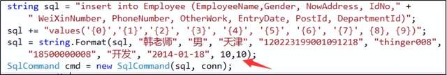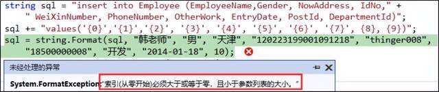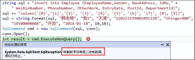 最近小伙伴学习数据库真的是掉头发啊,错误一堆堆,总也解决不完,其实对于我们老鸟来说,如果认真总结一下,会发现错误就那么几种,掌握了你就是数据库老鸟,来吧一起看看都有啥。 《C#程序》的错误提示: 《SQLServer数据库的错误》 【问题分析】:以上两种错误都是同一个原因,就是sql语句中“字段的个数”和实际“字段 值”(values里面的)不一样导致的,解决方法就是仔细检查,有多少个字段,然后看给的对应值的个数是不是也是一样的,以上错误就是values后面的字段值,对应最后一个字段DepartmentId缺少了值,添加上即可。