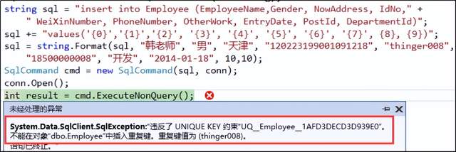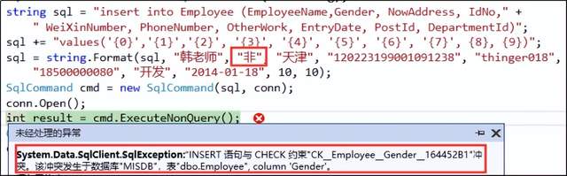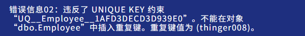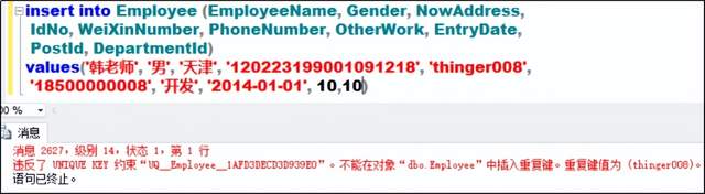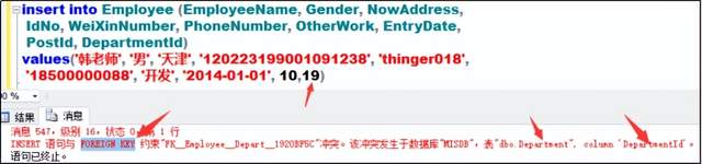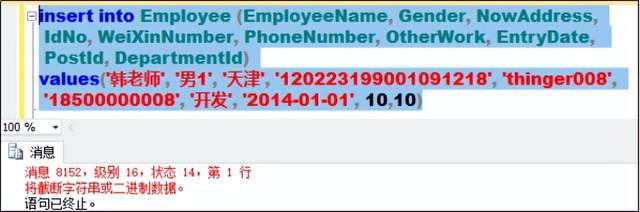 《SQLServer数据库的错误》 【问题分析】:以上两种相同错误“插入重复键”,就是因为在数据表中,某些字段添加了“唯一约束”,这种问题,可以自己打开数据表,肯定有这种情况,比如上面的表中,身份证号就是唯一约束,但是我们从数据库中,查看数据表Employee发现,这个身份证号(120223199001091218)已经存在了,所以报错。 【解决方法】:改换成不同的身份号就行了。 《C#程序》的错误提示: 《SQLServer数据库的错误》 【问题分析】:以上两种相同的错误,是因为我们给的values中,有的字段值超过了字段定义的长度,这时候,需要去数据库中看一下具体的每个字段的长度,然后对比SQL语句中给的值,当然如果有很多字段,也不是每一个都对比,一般就是看看“字符串类型的字段”就可以了,经过查看,在Gender字段中,我们设置的是char(2)两个字符长度,而我们给的值是“男1”,也就是3个字符,所以超出长度,报错。 【问题解决】:只需要改成“男”就可以了。 《C#程序》的错误提示: 《SQLServer数据库的错误》 【问题分析】:凡是提示“CHECK约束冲突”的,一定要检查当前表中哪些字段添加了CHECK约束,然后根据约束要求,去核对values中的字段值,比如我们这个表中Gender性别列增加了如下约束: 右键点击表名称,选择“设计”,然后在表的设计状态下,任何地方再次右键,选择CHECK约束: 弹窗如下窗口: 发现,Gender的约束是“男”或“女”,而在上面的SQL语句中,我们写了“非”,所以报错。类似的问题,比如你给某一个字段设置成30-50范围的值,而你的数据不在这个范围,同样也是这个错误。 【问题解决】:只需要把values中的“非”改成“男”就可以了。 《C#程序》的错误提示: 《SQLServer数据库的错误》 【问题分析】:以上两个错误是一样的,非常明确的提示了是“Foreign key”约束,并且告诉了是表“Department”,对应的字段是“DepartmentId”。这样的话,我们就去核对一下,当前SQL语句中最后一个字段19对应的是DepartmentId,所以,我们去Department表中,看看所有的DepartmentId列中,有没有这个19,打开数据表如下: 发现确实没有19,这样的话主键表里面没有的数据,从表中是不能使用的,这个也是外键约束的基本要求。 【问题解决】:只要把19改成,数据表中10-15中的值就可以了。 【特别提示】:只要是“约束冲突”,检查的方法都一样,看清楚错误提示的是什么类型的约束,然后去表中查看,仔细核对即可。 以上问题,只要用数据库,其实不管是老鸟还是新手,都会遇到,而在这里如何快速解决才是我们今天这篇文章的关键。 |