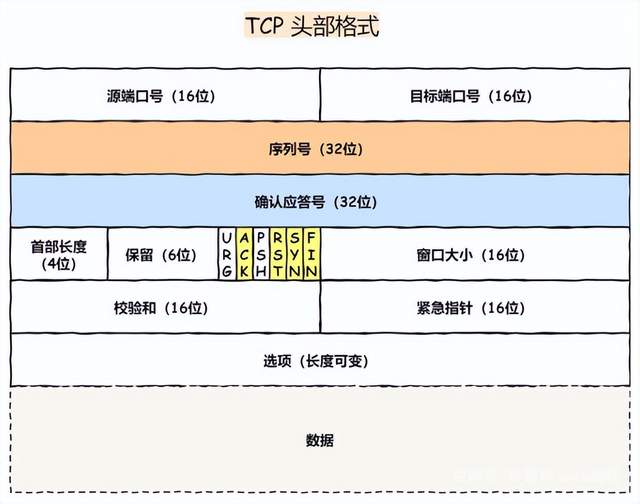 TCP 保证数据不丢失、不重复、按需到达 UDP 是尽最大努力交付,不保证交付数据 TCP 有拥塞控制和流量控制机制 UDP 则没有拥塞控制和流量控制机制 06、TCP首部报文分析 TCP的首部至少占用20个字节,包含的内容有源端口号、目标端口号、序列号、应答号、控制位、校验和等,具体如下所示: 07、简要说明TCP三次握手