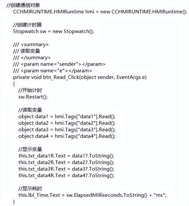 在工控领域中,WINCC仍然占有很大的市场份额。很多时候我们说学习C#开发上位机可以取代传统的组态软件,两者就像冤家一样,然而,即使是冤家,也会有联合的时候。当我们的项目已经采用WINCC落地之后,已经学会C#的我们,还能做哪些事情呢?今天跟大家分享一下如何使用C#,与WINCC联合实现数据通信。 1. 环境搭建众所周知,WINCC作为西门子家族的一款组态软件,主要是用来和PLC(主要是西门子PLC)通信,因此我们选择的硬件就是一款西门子S7-1200 PLC。软件方面,使用的是WINCC V7.4(其他版本待测试),以及宇宙第一IDE——VS 2019。 这里有个问题提醒一下,当我安装好WINCC V7.4,通过添加驱动和S7-1200 PLC通信时,怎么都连接不上,最后发现应该是WINCC的S7-1200 PLC的驱动有点BUG,缺少一些组件,通过安装TIA博图之后,最终解决。 如果想通过C#联合WINCC访问到PLC里的变量,前提是WINCC项目已经开发好,并且处于运行状态,操作步骤如下: 首先创建一个S7连接,并创建4个变量分别为data1、data2、data3、data4,地址对应DB100.DBD0、DB100.DBD4、DB100.DBD8、DB100.DBD12。 接着创建一个画面,拖入4个显示控件,分别绑定这4个变量,通过博图将4个变量的值分别设置为50.5、60.5、70.5、80.5, 然后运行WINCC画面。 接下来我们要做的是通过编写一个简单的Winform程序来读取WINCC中这4个变量的值并显示,这里有两种方式可以实现这样的效果,一种是通过直接访问WINCC变量进行读取,另一种是通过访问WINCC画面中的控件。 2. 访问WINCC变量1、首先创建一个新的Windows窗体应用,再从WINCC安装目录中找到两个dll,分别是CCHMIRuntime.dll和CCHMITags.dll,位置默认处于C:\Program Files (x86)\Common Files\Siemens\Bin,将这两个dll复制到debug根目录下并手动添加引用。 2、Windows窗体界面设计如下图所示: 3、编写读取代码 4、编写写入代码 5、读取结果: 6、写入结果 3. 访问WINCC控件1、重新新建一个窗体,窗体内容和布局与之前一致: 2、读取代码 3、写入代码 4、读取结果 5、写入结果 这里值得注意的是,通过访问控件实现的写入并没有真正写入PLC,所以这种方式仅限于读取数据,但可以通过这种方式来设置控件的其他属性,比如样式、背景、文本等。 本文主要以学习研究为主,针对C#与WINCC之间的数据通信做了较为详尽的描述,相信对于很多电气工程师,尤其是以西门子PLC为主的电气工程师来说,会有很大帮助。也许这种情形目前用途不那么广泛,但是出现这种需求时,就会变得很有用。 我一直坚信因为努力才会有结果,而不是因为看到结果,才想着去努力,而是就像学习C#和上位机一样,你如果不学习,这些内容对你来说可能就是天方夜谭,但是如果你提前学习了,你会发现其实很简单。 近几年随着人工智能、物联网的普及,工控行业发生了很大的变化,每一位电气工程师都应该及时作出调整,至少学习一门高级编程语言,未雨绸缪,以更好的姿态来应对即将到来的智能制造2025。 |