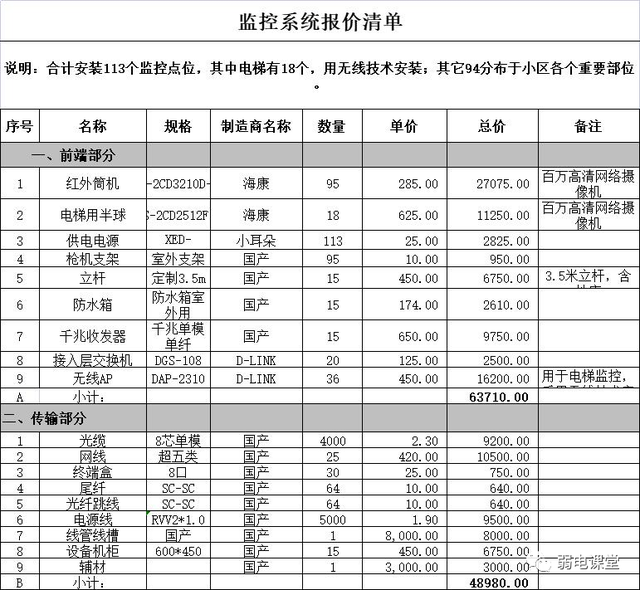 对于小区的监控项目,我们前面曾提到过一些,主要是针对小区监控项目的方案,本期我们来看下小区监控的报价,一般的小区监控项目,基本上都是100个点位左右,那么100个点位的监控项目一般造价是多少呢? 我们都知道,监控项目造价主要分为三部分:设备费用、施工费用、税金等,有的大型的监控项目还有调试费用,不过一般规模的小区监控很少有,那么我们就来通过下面这份案例来详细了解下。 另外我们已开通知识星球,我们总结了一些资料,想要下载相关弱电精品资料的,可以扫码加入。 100个点位的小区监控报价案例: 普通的小区监控项目100个点位,造价基本上都是在35万左右,决定价格的费用主要是后端的设备,因为前端的设备价格太透明了,另外与存储的时间有关,有的时候是存储20天,有的是需要存储40天或60天,所以可能同样的点位造价相差很大,主要是在后端设备与或存储的时间上。 |