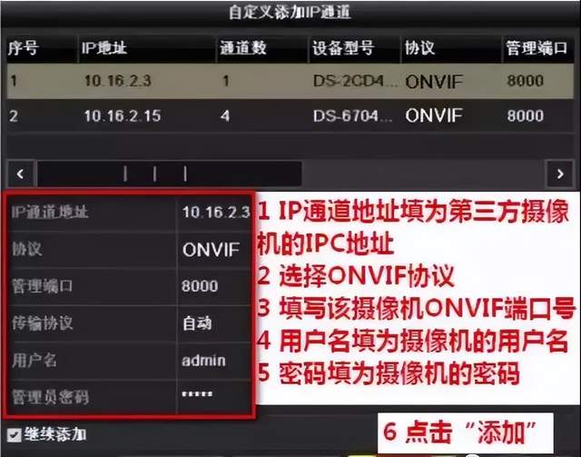 关于摄像头与NVR混搭的问题,这个在实际项目中非常常见,今天我们就这方面的问题做个专题,了解清楚主流的摄像混搭添加的方法。 要了解NVR与摄像头如何混搭使用?我们需要了解这三个常见的混搭。 1、海康的NVR如何添加其它牌子摄像头? 2、大华的NVR如何添加其它牌子摄像头? 3、宇视科技录像机如何添加海康威视摄像头? 一、海康的录像机添加其它牌子摄像头 1、海康威视型号不含“/P”“/N”的录像机接入其它牌子摄像头方法如下: 第一步:固定录像机的IPv4地址(主菜单—系统配置—网络配置—基本配置) 基本设置 界面里“启用”自动获取ipv4地址不要钩选。 第二步:自定义添加 注意一:第三方摄像机如果没有密码,建议先将密码设置为12345,再添加。 注意二:确认第三方的摄像机的ip地址与录像机的地址在同一网段(修改第三方摄像机ip地址建议联系摄像机厂家咨询)。 2、录像机 型号含“/P”“/N”的NVR添加第三方摄像机方法如下: ①.支持标准onvif协议 ②.用户名:admin,密码跟录像机密码设为一致。 ③.摄像机的IP需跟录像机内部网卡IPV4地址在同一网段。 第三方摄像机的参数及如何设置,建议联系第三方摄像机厂家咨询。如果按照以上方式还是添加不上,建议给POE摄像机外接电源,再接入到录像机的LAN口进行添加。 二、大华的录像机如何添加其它牌子的摄像头 nvr录像机添加ipc经常出问题,有的时候添加不进去,有的时候搜索不到ip,对于有一定网络基础的朋友来说,这个是比较简单的过程,这里面我就来一起熟悉这个添加过程,以大华为例,有几个点还是需要注意的。 注意:连接大华录像机前请先修改摄像头ip地址,然后在进行添加操作。 1、启动大华录像机的点击下一步进入开机向导。 2、输入录像机的用户名和密码点击登录。 3、进入普通设置看看如果时间不准修改一下点击保存就可以了,如果时间正常可以直接点击下一步跳过。 4、进入网络设置把DHCP前边的“√”去掉,ip不要自动获取,可以把Ip固定成192.168.1.9(如下图)其它不用修改,直接点击下一步。 5、点击设备搜索,如果搜到设备就说明连接正常,如果没有搜到请检测录像机是否和摄像头同一网段?网线有没有连接好? 6、选中搜到的摄像头ip点击下边的添加。 7、添加摄像头成功后下边的列表会出现摄像头的ip,连接状态是(绿色小圈)。显示(红色小圈)的话就说明就说明没有添加好,重新添加就可以了。 8、手动添加的设备就直接点击手动添加。 9、手动添加选要选择摄像头要添加通道路数,厂商协议改成 onvif协议,手动输入摄像头的之前修改好的ip地址,再将HTTP端口号改成8899 ,直接点击确定保存即可。 10、成功手动添加好摄像头。 11、设置好录像模式,点击完成即可保存好添加的所有监控摄像头。 三、宇视录像机添加海康的摄像头 宇视录像机如何添加海康威视摄像头。 方法一: 进入海康威视的摄像头主页、点击“配置”选项、找到“安全管理”或者“高级配置”里面的“安全服务”、将“开启非法登录锁定”勾选关闭即可。 方法二: 将海康威视摄像头的协议改成ONVIF、以及将视频编码改成H265 |