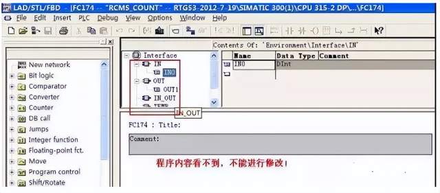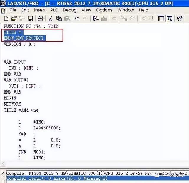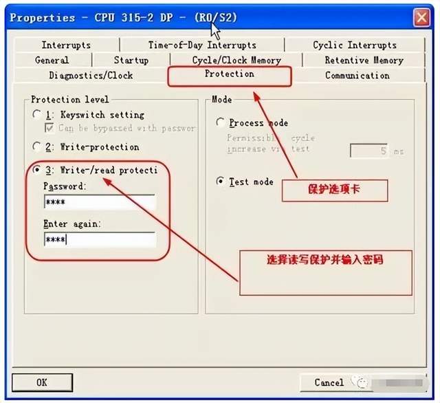 通过STEP7软件的KNOW_HOW_PROTECT功能实现对您程序代码的加密保护。 如果您双击鼠标打开经过加密的程序块时,您只能看到该程序块的接口数据(即IN, OUT 和 IN/OUT 等类型的参数)和注释信息,而程序块中的代码及代码的注释,临时/静态变量是不能被看到的。同时您也无法对加密保护的程序块做出任何改动。 程序块保护实现步骤: 1.打开程序编辑窗口LAD/FBD/STL; 2.将要进行加密保护的程序块生成转换为源代码文件(通过选择菜单 File—>Generate source 生成); 3.在LAD/FBD/STL 窗口中关闭您的程序块,并在SIMATIC Manager项目管理窗口的source文件夹中打开上一步所生成的source文件; 4.在程序块的声明部分,TITLE行下面的一行中输入KNOW_HOW_PROTECT; 5.存盘并编译该source文件(选择菜单FileàSave,FileàCompile); 6.现在就完成了您程序块的加密保护; 如下图中表示了如何对STL source文件进行加密: 取消对程序块的加密保护 1. 打开程序块的Source源文件; 2. 删除文件中的KNOW_HOW_PROTECT; 3. 存盘并编译该source文件; 4. 现在程序块的加密保护已经取消。 注意:如果没有STL source 源文件,您是无法对已经加密的程序块进行编辑的! 02 二、PLC密码设置方法截图 设置PLC密码保护 当我们写好程序下载到PLC之后就希望PLC能正常稳定的运行。为了防止人为出现的故障,要对PLC设置使用权限,来保护PLC程序不会被更改或程序被删除。如何设置这个口令来保护PLC呢?? 1. 打开硬件组态界面 打开STEP7 单击目录中的SIMATIC 300 station,双击右窗口的Hardware 图标,从而入硬件组态界面。 2.双击CPU模块 3.选择protection 选项卡 选项卡中有三个保护级别,它们具体功能如下: 保护级别(Protection level) 1. No protection(无保护) 2. Write-protection(写保护:程序可读不可写) 3. Write-/read protecti(读写保护:即不可读也不可写) 4. 选择级别三(读写保护),并输入密码并保存. 设置好读写口令保护之后,当我们要改写程序或读程序时,就会弹出输入口令模框,提示您输入口令,只有输入的口令正确才可以正常读写。 |