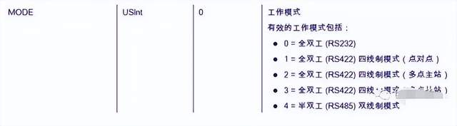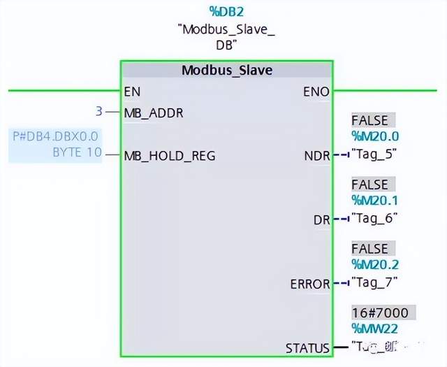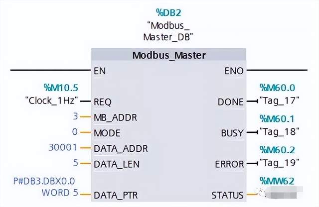 然后打开OB1,进行编程,如下所示: 先调用初始化的块 MODBUS COMMONLOAD 管脚说明: REQ: 指令起始于上升沿(0 到 1)。 PORT: 安装并组态完 CM 后,便可在设备组态的“硬件ID”(Hardware ID) 属性中找到 CM 端口值。符号端口名称在 PLC 变量表的“系统常数”(Systemconstants) 选项卡中指定。就是前面提到的硬件标识符 BAUD: 选择数据传输速率: 1 = 300, 2 = 600, 3= 1200, 4 = 2400, 5 = 4800, 6 = 9600, 7 = 19200, 8 = 38400, 9 = 57600, 10 =76800, 11 = 115200 bit/s。所有其它值无效。 PARITY: 选择奇偶校验: · 0 – 无 · 1 – 奇校验 · 2 – 偶校验 RESP_TO: 响应超时: 5 ms 到 65535 ms - Modbus_Master 等待从站响应的时间(以毫秒为单位)。如果从站在此时间段内未响应,Modbus_Master 将重复请求,或者在指定数量的重试请求后取消请求并提示错误(请参见下文,RETRIES 参数)。 MB_DB:用MODBUS MASTER的背景数据块里面的一部分,如下所示: 对 Modbus_Master 或Modbus_Slave 指令的背景数据块的引用。必须以 Modbus_Master 或 Modbus_Slave 指令的 MB_DB 参数替换 MB_DB 参数(静态,因此在指令中不可见)。 然后调用MODBUS MASTER 的功能块,如下所示: 管脚说明如下所示: REQ;是脉冲信号,给一次脉冲,收发一次 MB_ADDR:是从站地址 MODE:读写模式,0是读,1是写 DATA_ADDR:对应功能码 LEN:数据长度 DATA_PRA:接收或发送的存储区域 上述是模式和功能码的对应关系 除上述做法,还需要设置一个地方: 打开MODBUS COMMON LOAD的背景数据块,如下所示: 将MODE 设置成4 上述是主站的总结 接下来说一下从站的设置: 前面参数和主站是一样的,就是调用MODBUS SLAVE需要说明一下: MB_ADDR: MODBUS 的从站地址 MB_HOLD_REG:这对应的是40001的功能码 例如00001的功能码对应的是 Q0.0 10001 ------I0.0 30001-------IW0 其余和主站设置一样. |