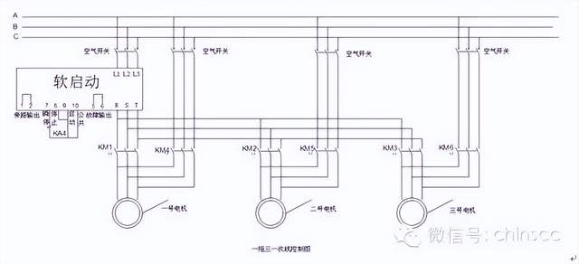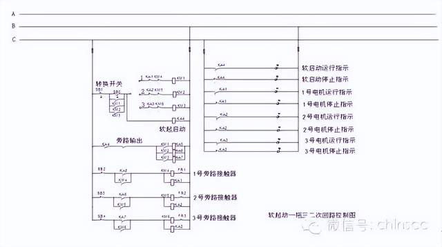 1、深川软起动应用场所 深川软起动可广泛应用于冶金、化工、石油、供水、矿山、建材、电机行业中的泵类、风机、压缩机、轧机、注塑机、皮带运输机等各种设备。 2、深川软起动控制组成 软起动器控制柜是由内装的软启动器加外围的断路器、接触器、继电器、指示灯、按扭等电气元件和柜体组成的,是对三相交流电动机(包括风机,泵)控制的交流拖动装置。 3、深川软起动柜工作原理及一二次回路控制图 该电路由二部分组成,二次控制电路和软起动器接线控制电路。启动前先将转换开关调至1号电机,当按下按钮SB0时,交流接触器KM1线圈得电动作且自锁。将软起动输出线与1号电机相连,同时中间继电器KA4得电动作,软起动运行且指示灯亮。1号电机开始运行,当电机达到额定转速后旁路输出点动作使KA5得电动作,1号旁路接触器KA4得电吸合且自锁,同时KA1中间继电器也同时动作,1号运行指示灯亮,同时KA1,KM4给KM1接触器和KA4中继复位,软起动器停止运行,同时停止指示灯亮。 当需要启动2号电动机时,转换开关调至2号电机,按下软起启动按钮SB0,交流接触器KM2得电动作且自锁,将软起动输出线与2号电机相连,同时KA4得电软起动器运行且运行指示灯亮。2号电动机开始运行,当2号电机转速接近(或达到)额定转速时,软起动旁路输出点动作使KA6得电启动交流接触器KM5得电吸合且自锁.同时KA2中继得电,运行指示灯亮,KM5,KA2得电后给KM2,KA4复位,软起动停止运行且停止指示灯亮。 当需要启动3号电动机时,转换开关调至3号电机,按下软起启动按钮SB0,交流接触器KM3得电动作且自锁,将软起动输出线与3号电机相连,同时KA4得电软起动器运行且运行指示灯亮。3号电动机开始运行,当3号电机转速接近(或达到)额定转速时,软起动旁路输出点动作使KA7得电启动交流接触器KM6得电吸合且自锁.同时KA3中继得电,运行指示灯亮,KM6,KA3得电后给KM3,KA4复位,软起动停止运行且停止指示灯亮。当1号(或2,3)电机需要停机时,按下停止按钮SB2(或SB3,SB4).交流接触器KM4(或KM5,KM6)失电释放,其主触点断开电源。电动机1号(或2,3)失电停止运行,同时KA1(或KA2,KA3)中继复位1号(或2,3)停止指示灯亮。 当1号(或2,3)电机发生过电流、断相、堵转等故障时,热保护继电器FR1动作,切断接触器KM4(或KM5,KM6)线圈电源,线圈失电主触点断开三相电源切断,电动机号l号(或2,3)失电停止运行。同时KA1(或 KA2,KA3)中继复位1号(或2,3)停止指示灯亮。 软起一拖三一次控制图 软起一拖三二次回路接线图 |