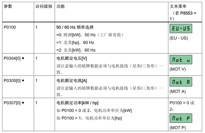 设置完成后,变频器会显示“8 8 8 8 8”字样后,显示50?,点击“OK”确认,此时P0970 及 P0010自动复位至初始值0。 2、设置电机参数。