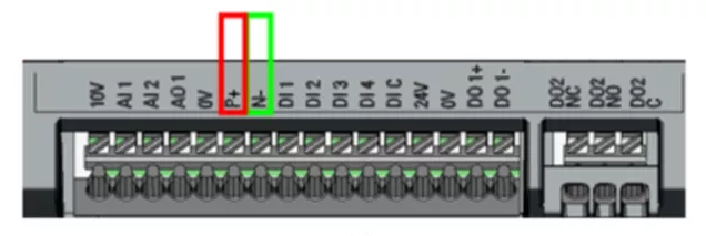 6、至此变频器快速设置完成,长按M返回。 通信测试1、进行ModbusRTU通信,首先要接好485信号线,将A、B两根线接到端子6和7上。