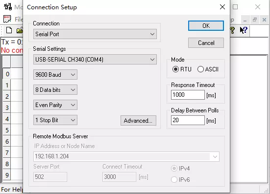 5、打开ModbusPoll软件进行通信测试。