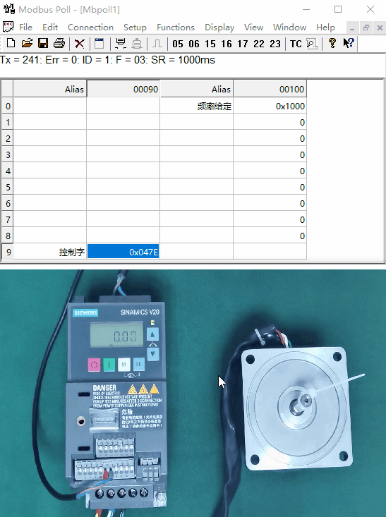 6、向40100控制字寄存器中写入16进制的047E停止变频器,再写入047F启动变频器。 7、向40101速度设定值寄存器写入16进制的0-4000H对应0-100%的P2000基准频率。 测试结果如下所示:
