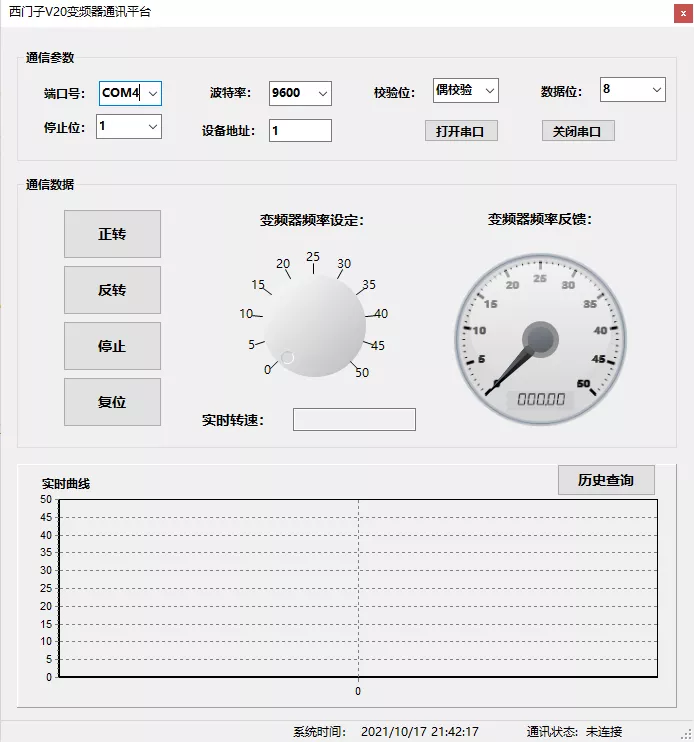 上位机通信通信测试完成后,我们可以通过C#编写一个上位机软件来对西门子V20变频器进行正反转控制和实时数据监测。