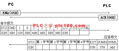 编写PC的通信程序可采用汇编语言编写,或采用各种高级语言编写,或采用工控组态软件,或直接采用PLC厂家的通信软件(如三菱的MELSE MEDOC等) 下面利用VB6.0以一个简单的例子来说明编写通信程序的要点。假设PC要求从PLC中读入从D123开始的4个字节的数据(D123、D124),其传输应答过程及报文如图7-16所示。