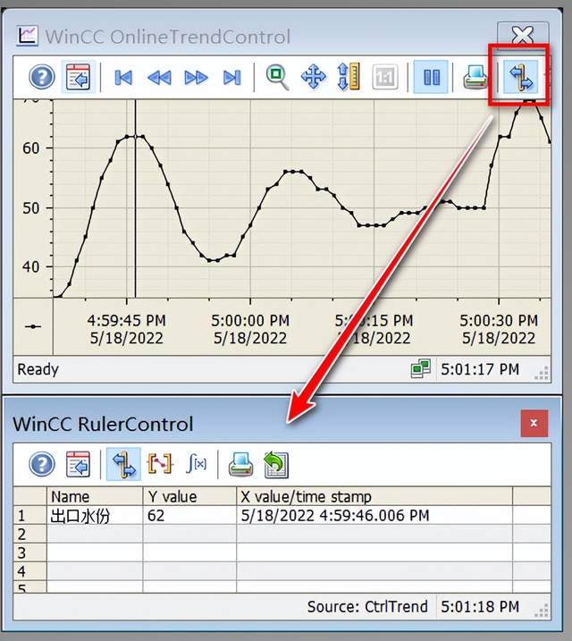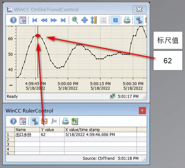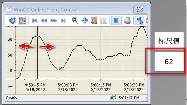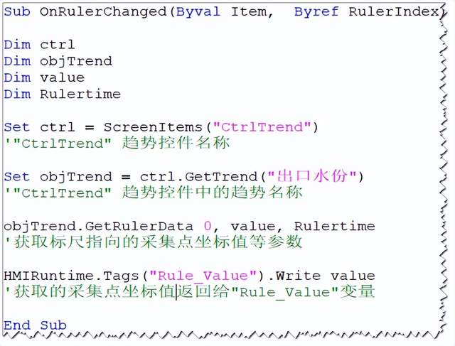 WINCC项目中的在线趋势控件(WinCC OnlineTrendControl)通常用来显示一些生产中的过程值数据曲线,例如出口水份、出口温度等。我们在观察趋势的同时如果希望查看某一个采集点的坐标值,可以使用标尺功能。画面在加载趋势控件时可以默认使用此功能,或者通过趋势控件工具栏调用标尺。如下图所示,趋势图的那条竖线就是标尺,操作员可以用鼠标拖动标尺置于某个采集点上,采集点的 x 轴时间戳,y 轴的过程数值就会显示在标尺控件中。 接下来看看如何实现通过标尺控件来显示标尺位置的坐标值。 首先,在WinCC画面上添加WinCC在线趋势控件,并关联过程变量。趋势的数据源可以选择在线变量或者归档变量。这里需要记住所组态的控件名称和趋势对象名称,后面的组态会用到。 如果需要趋势控件加载后直接显示标尺,可以在控件属性对话框的常规选项中勾选“显示标尺”。 接下来从控件列表中直接拖拽WinCC标尺控件(WinCC RulerControl)到WinCC画面中,然后双击标尺控件,在弹出的组态对话框中,关联所要显示坐标值的趋势控件名称,然后保存画面并激活运行。 趋势控件加载后,可以通过工具栏上的标尺按钮,激活标尺功能并弹出标尺控件,如下图所示。如果激活了前面介绍的“显示标尺”功能,标尺控件会随着趋势控件加载自动显示。 当标尺被打开后,通过鼠标移动标尺位置时,标尺所指向的过程变量值和时间戳就会显示在标尺控件的表格当中。 如果发现在曲线中有某些异常值时,能否将这个值和对应的时间戳读取出来进一步利用呢? 这时,就可以通过脚本读取坐标值写入变量的方式来实现。 接下来就来看看通过脚本获取采集点坐标值的组态方法。在项目中创建一个内部变量并通过IO域显示在画面上,这个变量用来显示通过脚本读到的采集点标坐标值。 然后选择趋势控件的事件列表->对象事件-> OnRulerChanged 事件,在此事件动作中添加VBS动作。 所需添加的VBS脚本如下图所示, 当WinCC趋势控件加载后,调用标尺功能并拖动标尺,脚本将把标尺指向的采集点坐标值输出到变量。 |