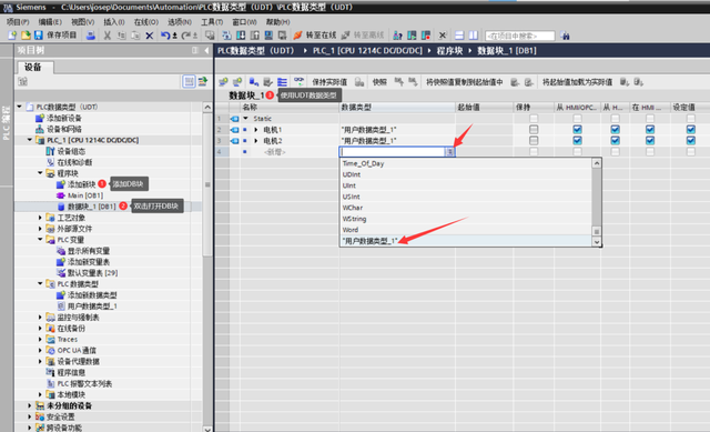 一、什么是UDT数据类型 西门子PLC(Programmable Logic Controller)的自定义数据类型(User Defined Type,简称UDT)是一种自定义的数据结构,可以根据具体需求定义一种包含多个不同数据类型的数据类型。 二、UDT数据类型使用方法 1. 进入PLC编程软件(如TIA Portal)中的程序编辑界面。 2. 在编程界面中选择某个数据块(如OB、DB等),右键单击鼠标,在弹出的菜单中选择“UDT”选项。 3. 在弹出的窗口中,点击“新建”按钮来创建一个新的UDT。 4. 在UDT编辑界面,可以根据需要为UDT添加不同的成员变量。通过点击“添加”按钮,选择需要的数据类型,并为该成员变量指定一个名称。 5. 为每个成员变量指定一个数据类型和长度,可以是基本数据类型(如整型、浮点型等),也可以是其他自定义的数据类型。 6. 完成UDT成员变量的定义后,可以点击“保存”按钮保存该UDT。 7. 在PLC程序中可以使用已定义的UDT进行数据处理。可以声明一个变量为已定义的UDT类型,并使用该变量进行数据操作。 8. 在程序中可以使用UDT变量的成员变量进行读取、写入和计算等操作,以满足具体的控制需求。 通过使用自定义数据类型(UDT),可以提高PLC程序的可读性和可维护性,减少重复代码的编写。 需要注意的是,具体PLC型号和编程软件的操作步骤可能会有所不同,请参考相关的西门子PLC文档或咨询相关专业人士以获取详细的操作指导。 三、UDT使用技巧分享 1、UDT在PLC变量表的应用在PLC数据类型中添加对应的UDT,并编写数据,然后在PLC变量表中使用,如图4所示。 图 4 PLC变量表中使用UDT 需要注意的是,在PLC变量表中使用UDT,一般只适合变量连续的场合。 2、UDT在全局数据块中使用UDT在全局数据块的使用,有两种情况,一种是UDT类型的全局数据块,一种是UDT类型是全局数据块的一个元素。情况1如图5所示。 图 5 UDT类型的全局数据块 情况2如图6所示。 图 6 UDT类型在全局数据块中使用 3、UDT类型在博图WINCC中使用在博图WinCC中的HMI变量可以直接使用UDT数据类型,这种方式相比单个类型的变量更加方便,如图7所示。 图 7 UDT类型在HMI中使用 UDT除了这些使用比较方便外,还可能方便进行修改,假设我的某个UDT的元素需要进行修改,可以在UDT的类型中进行修改,在编译一下,所有用到该UDT的都可以进行快速修改,如图8所示。 图 8 UDT的数据修改 |