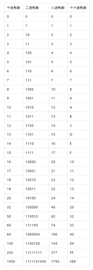 一、什么是进位计数制 数制也称计数制,是指用一组固定的符号和统一的规则来表示数值的方法。按进位的原则进行计数的方法,称为进位计数制。比如,在十进位计数制中,是按照“逢十进一”的原则进行计数的。 常用进位计数制: 1、十进制(Decimal notation),有10个基数:0 ~~ 9 ,逢十进一; 2、二进制(Binary notation),有2 个基数:0 ~~ 1 ,逢二进一; 3、八进制(Octal notation),有8个基数:0 ~~ 7 ,逢八进一; 4、十六进制数(Hexdecimal notation),有16个基数:0 ~~ 9,A,B,C,D,E,F (A=10,B=11,C=12,D=13,E=14,F=15) ,逢十六进一。 ![]()