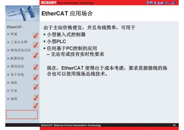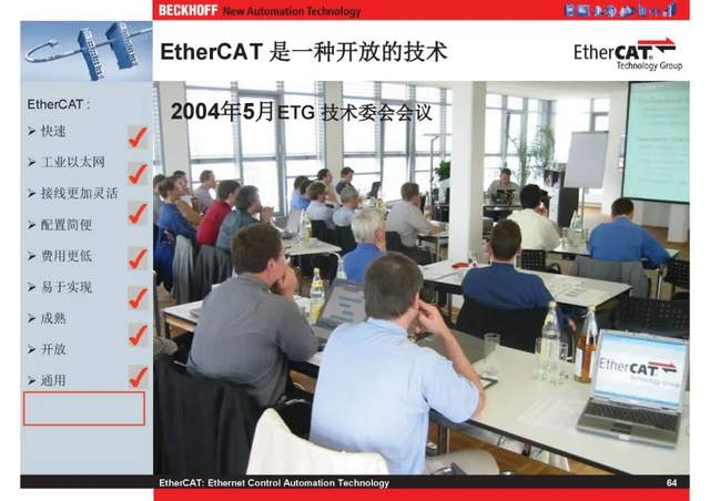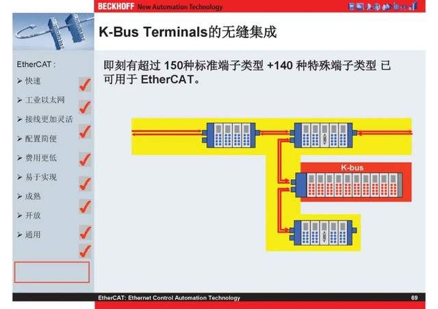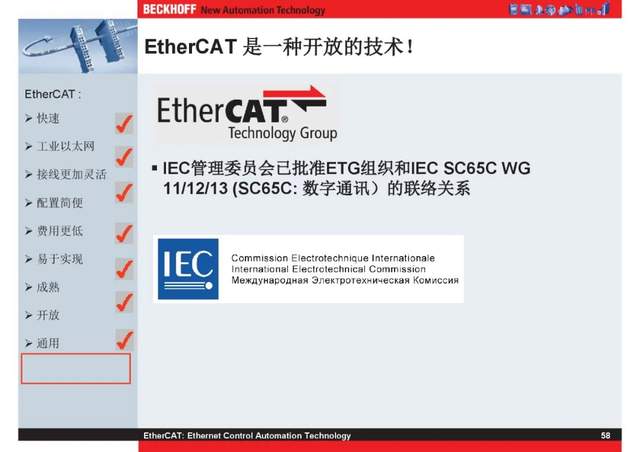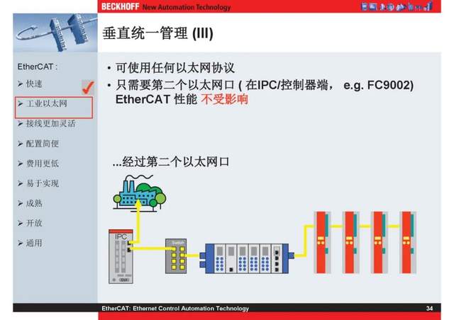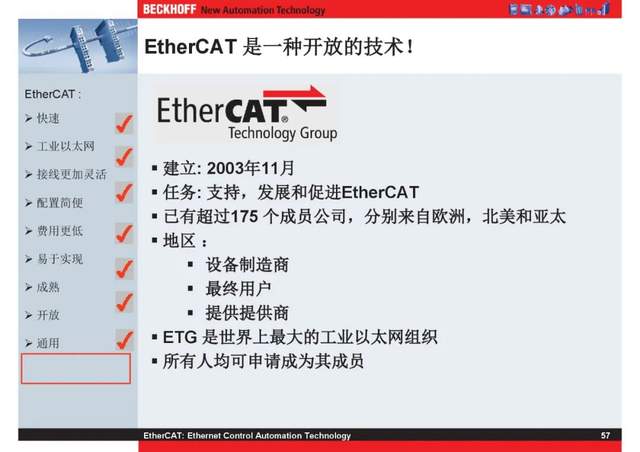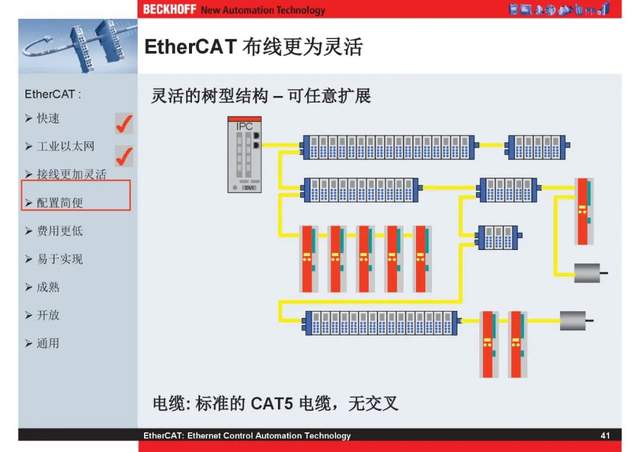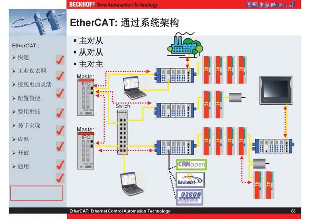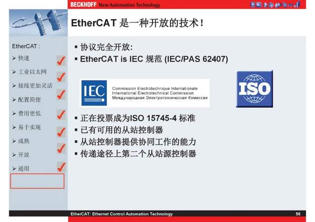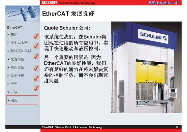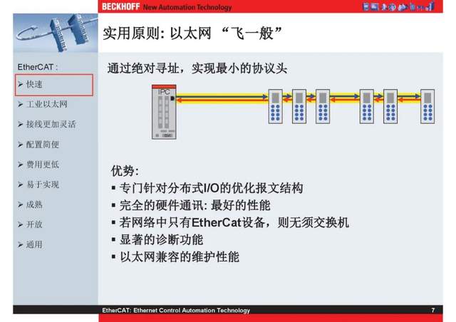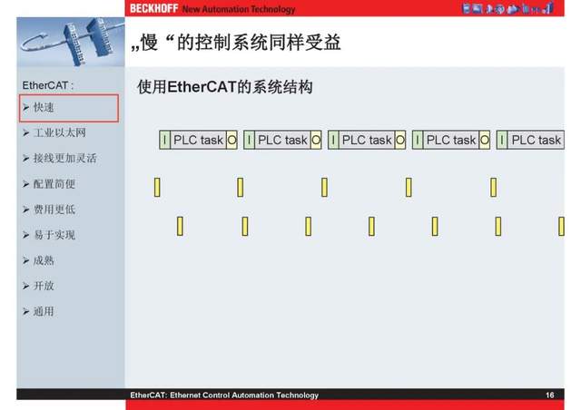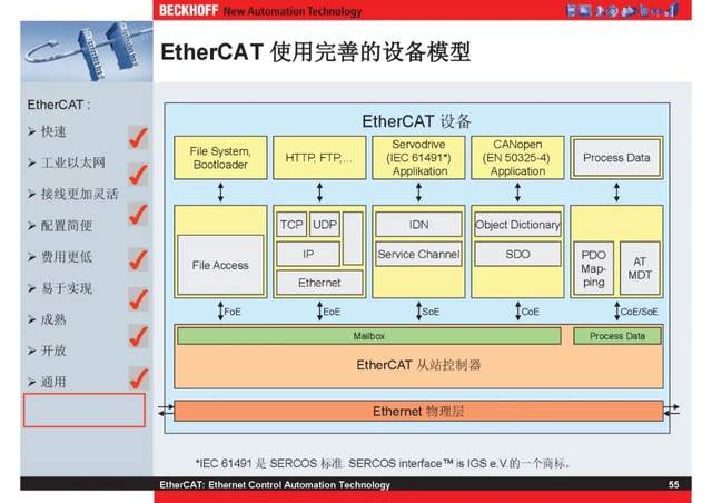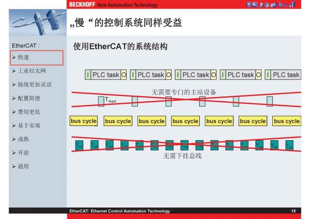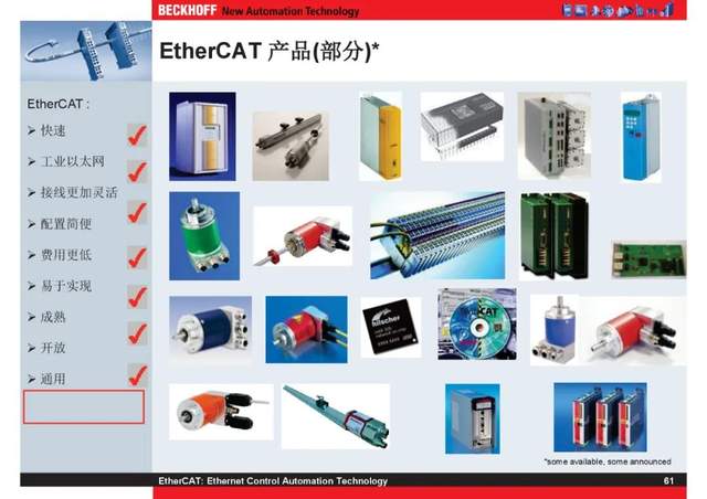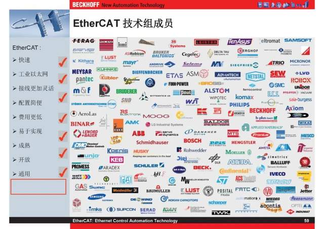 概述 EtherCAT最初由德国倍福研发。EtherCAT为系统的实时性能和拓扑的灵活性树立了新的标准,同时它还符合甚至降低了现场总线的使用成本。EtherCAT的特点还包括高精度设备同步、可选线缆冗余和功能性安全协议(SIL3)。 |