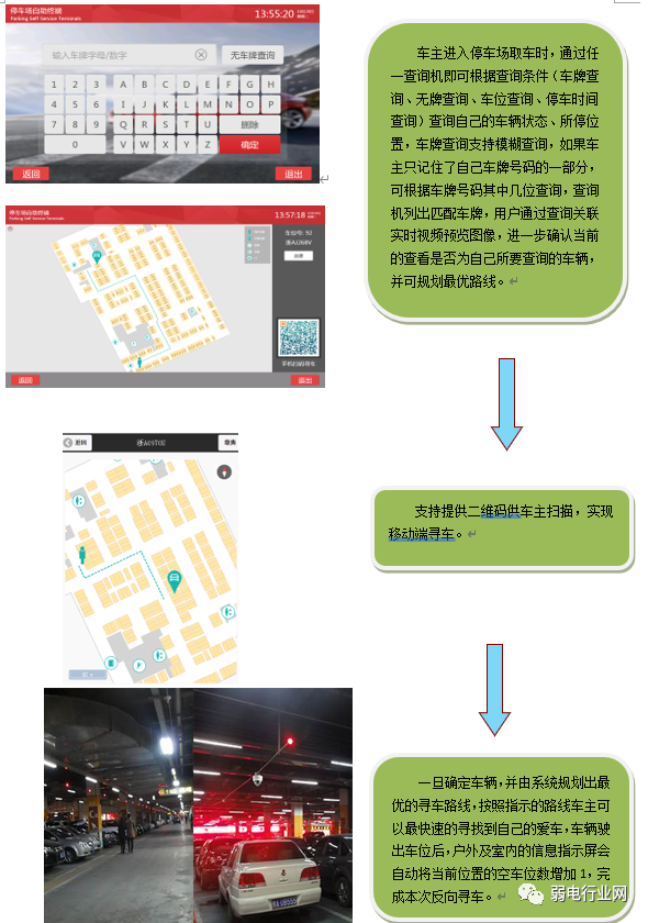 车辆检测器 用于防砸线圈检测。 遥控发射接收器 接收无线遥控信号,并转换信号。 遥控发射器 发送无线信号。 车牌识别模块主要设备 出入口视频单元 成像清晰是牌照识别的技术关键。本系统采用专用抓拍摄像机,整个图像成像控制系统是一个由抓拍摄像机、智能补光灯、成像控制软件组成的精密系统,它们之间的精确配合使得白天和晚上抓拍的车牌图像都更利于车牌识别。无论是环境照度比较低的情况下(例如夜晚),还是在强光照射下(例如晴天正午),系统均会自动调整抓拍摄像机的成像模式,使用软硬件结合的方法控制图像的曝光,保证车牌成像清晰度,非常有利于人工辨认和机器自动识别车辆牌照信息。 补光单元 智能补光灯由抓拍摄像机控制,在环境照度不足的情况下,抓拍摄像机执行精确的控制指令控制智能补光灯补光,这样保证了在全天候环境下本系统都能拍摄到包含清晰牌照图像的理想图片,在实际的使用场景中,如果要看清驾驶室人脸需要采用闪光灯,如不需要看清人脸,则采用普通的LED频闪灯。 车辆检测器 本系统采用线圈触发方式,由前端车辆检测器来检测来往通行车辆,可与防砸线圈车检器共用。 出入口控制终端 出入口控制终端负责进行前端数据(车辆信息)采集、处理、上传后端平台,可实现实时视频、抓拍图片显示、进出抓拍图片关联、实时报警信息显示、系统日志显示、软件开关闸、高峰期锁闸、设备连接状态显示、报警联动等功能。 蓝牙读卡器 对车辆上配置的蓝牙卡进行高效准确读取,确保百分百对内部车辆的快速开门,排除各种环境因素。 三、网络传输子系统 负责完成数据、图片、视频的传输与交换。其中前端主要由交换机、光纤收发器等组成;中心网络主要由接入层交换机以及核心交换机组成。 四、后端平台管理子系统 平台完成数据信息的接入、比对、记录、分析与共享。由以下软件模块组成,包括:数据库服务器、数据处理服务器、Web服务器。其中数据库服务器安装数据库软件保存系统各类数据信息;数据处理服务器安装应用处理模块负责数据的解析、存储、转发以及上下级通讯等;Web服务器安装Web Server负责向B/S用户提供访问服务。 Ø 自助缴费终端 录入车牌号码,选择出场时段后,由自助缴费终端完成收费金额的计算、收取、找零,并打印收费小票上传收费记录,实现车辆不停车出场; Ø 中心人工缴费窗口 录入车牌号码,选择出场时段后,自动匹配车辆入场记录,在未匹配到入场的情况下由收费员“模糊查询”确认并选取入场图片,收取停车费用(刷卡、现金),车辆不停车出场; 五、诱导、反向寻车部分诱导、反向寻车系统组成图 诱导部分主要由: 数据采集模块(包括车位监控相机、车位引导灯等)、中央控制模块(包括多路视频终端、中心服务器等)、数据库服务器、信息发布模块(包括室内引导屏、一体化终端查询机等)组成。 工作流程: 停车诱导: 反向寻车: 二 、系统功能 1、车辆管控固定车辆:车牌识别比对正确,即可进场,无需任何操作。 临时车辆:停车登记,抓拍车牌并识别记录,放行。 布控车辆:嫌疑车辆则系统自动在前端和中心产生报警,同时人工参与处理。 2、电动挡车器软件控制客户端或中心管理平台能够远程控制电动挡车器启闭,方便操作人员管理和特殊需要。 3、图片/视频预览过车图片和信息实时显示,视频实时预览,进出车辆自动匹配,图片预览按车道轮询。 4、1.1.4 LED屏显示控制主机包含语音提示系统、信息显示屏,车辆驶入、驶出可以根据客户需要提示语音,显示欢迎信息等。 5、号牌自动识别功能系统可自动对车辆牌照进行识别,包括车牌号码、车牌颜色的识别。 在实时记录通行车辆图像的同时,还具备对符合“GA36-92”(92式牌照)、“GA36-2007”(新号牌标准)、“GA36.1-2001”(02式新牌照)标准的民用车牌、警用车牌、军用车牌、武警车牌的车牌自动识别能力,包括2002式号牌。 系统能识别黑、白、蓝、黄、绿五种车牌颜色。 6、车辆信息记录车辆信息包括车辆通信信息和车辆图像信息两类。 在车辆通过出入口时,系统能准确记录车辆通行信息,如时间、地点、方向等。 在车辆通过出入口时,牌照识别系统能准确拍摄包含车辆前端、车牌的图像,并将图像和车辆通行信息传输给出入口控制终端,并可在图像一体的信息框内叠加车辆通行信息(如时间、地点等)。 可提供车头图像(可包含车辆全貌),在双立柱方案下,闪光灯补光时拍摄的图像可全天候清晰辨别驾驶室内司乘人员面部特征。单立柱方案时抓拍摄像机与闪光灯安装在同一根杆子上。 系统采用的抓拍摄像机,具备智能成像和控制补光功能,能够在各种复杂环境(如雨雾、强逆光、弱光照、强光照等)下和夜间拍摄出清晰的图片。 7、数据管理过车数据自动上传中心,由中心集中存储和管理,支持前端数据缓存以及断点续传。 8、数据查询可查询通行信息、报警信息、场内车辆、操作日志、设备状态等信息。 9、报警功能当系统识别出来的车辆车牌不符合条件时,或者车牌在黑名单库时,系统自动报警,提示工作人员进行检查,用户可根据实际需求选择不同的报警联动方式,如预览通道切换、报警输出、软件提示、LED显示等。 10、参数配置功能 设备参数配置可以实现本地配置,也可以进行远程配置。 11、权限管理用户可配置不同的角色和权