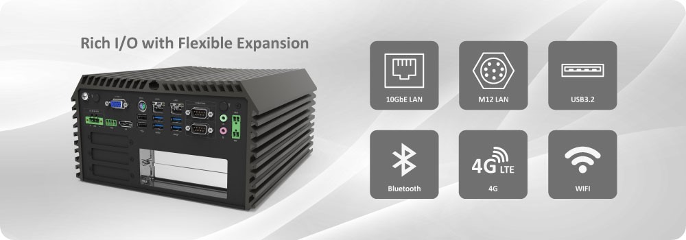 丰富的I/O与弹性扩展,满足AOI的串接需求 作为AOI的关键核心,DS-1400必须能够与周边装置相互串联,如高速镜头、光源、传感器及显示器等。除了原生高速的I/O接口(2x1GbE LAN、8xUSB),在预留的扩展区还可透过德承专属的模块化扩展10GbE LAN、M12 LAN、USB3.2接口或是PoE功能等。内置的Mini PCIe插槽,可搭配WIFI/4G模块实现无线通信功能,让人员能够实时远程监控生产状况及相关资讯。