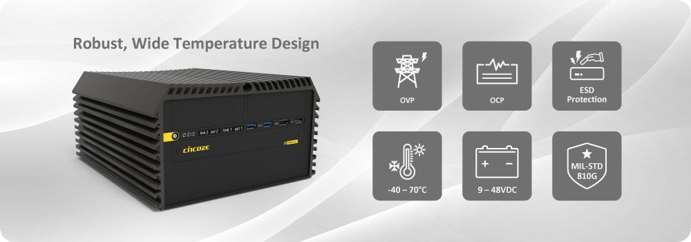 强固安全,军规级验证标准 作为德承强固型 - DIAMOND产品线旗下的边缘AI电脑,DS-1400系列延续了德承一贯的强固安全理念。除了具备宽温(-40~70°C)、宽压(9-48V)、过电压、过电流和静电保护等安全设计,DS-1400系列还符合军规抗冲击震动标准MIL-STD-810G,证明了其在严苛的工业环境中能够稳定安全地运行并持续长时间工作。 |