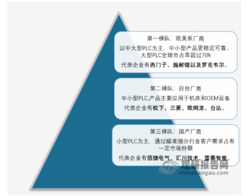 资料来源:观研天下数据中心整理 四、行业竞争格局 国内PLC市场整体由国外龙头企业主导,中国企业在小型PLC市场中逐渐展现竞争力。我国PLC行业市场集中度较高,欧日系占比较高。欧美厂商在我国中大型PLC市场具备强话语权,日系、台系厂商及本土厂商深耕国内中小型PLC市场。近年来,国产小型PLC正在凭借产品性价比高、交期短、客户需求快速响应的优势抢占中低端工业自动化市场的外资份额。新能源自动化设备需求增长以及疫情阻碍海外厂商供应链加快了这一进程。