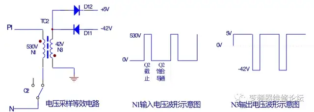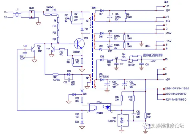 ——兼论电容C23在电路中的重要作用 先看以下电路实例: 图1 东元7200PA 37kW变频器开关电源电路 图2 海利普HLPP001543B型15kW变频器开关电源电路 图1、图2电路结构和原理基本上是相同的,下面以图1电路例简述其工作原理。 开关电源的供电取自直流回路的530V直流电压,由端子CN19引入到电源/驱动板。 电路原理简述:由R26~R33电源启动电路提供Q2上电时的起始基极偏压,由Q2的基极电流Ib的产生,导致了流经TC2主绕组Ic的产生,继而正反馈电压绕组也产生感应电压,经R32、D8加到Q2基极;强烈的正反馈过程,使Q2很快由放大区进入饱合区;正反馈电压绕组的感应电压由此降低,Q2由饱合区退出进入放大区,Ic开始减小;正反馈绕组的感应电压反向,由于强烈的正反馈作用,Q2又由放大状态进入截止区。以上电路为振荡电路。D2、R3将Q2截止期间正反馈电压绕组产生的负压,送入Q1基极,迫使其截止,停止对Q2的Ib的分流,R26-R33支路再次从电源提供Q1的起振电流,使电路进入下一个振荡循环过程。 5V输出电压作为负反馈信号(输出电压采样信号)经稳压电路,来控制Q2的导通程度,实施稳压控制。稳压电路由U1基准电压源、PC1光电耦合器、Q1分流管等组成。5V输出电压的高低变化,转化为PC1输入侧发光二极管的电流变化,进而使PC1输出测光电三极管的导通内阻变化,经D1、R6、PC1调整了Q2的偏置电流。以此调整输出电压使之稳定。 这是我的第二本有关变频器维修的书中,对图1电路原理的简述,由于疏漏了对电容C23作用的讲解,给读者带来了一些疑问:1)N2绕组负电压是如何加到Q2基极的?2)电路中C23的作用是什么?3)C23的充、放电回路是怎样走的?这3问题涉及到电路原理的关键部分,无它,开关电管Q2即无法完成由饱和导通→进入放大区→快速截止→重新导通的工作状态转换,三个问题其实又只是一个问题,即图1的C23(或图2中的C38)究竟对电路的工作状态转换起到怎样的重要作用?先不要忙,将这个问题暂且按下不表,先说几句题外话。 在由3844(42/43/34)PWM脉冲芯片为核心构成的开关电源电路,大行其道的今天,像图1、图2这样由两只双极型晶体管构成的开关电源电路(对比于集成器件,或称之为分立元件构成的开关电源),仍占有一席之地,在数个变频器厂家的产品中,得到应用。难道是厂家技术人员有怀旧情结吗?还是为了降低生产成本?其实都不是!采用分立元件做开关电源,设计人员肯定有更全面和深入的考虑。 而我的维修经验而论,我比较倾向和首肯于由分立元件构成的开关电源,理由是其工作可靠性高,故障率低,使用和维修都比较让人放心。电路的质量,并不取决于采用集成器件或分立元件,也不取决于电路采用元器件的数量多少,这些都是形式而非本质。相对于分立元件组成的电路,集电器件是否就具有技术上的先进性和工作上的可靠性?则真的是一个问号,不可一概而论。比较二者电路的设计难度,分立元件的电路,恐怕难度要更高一些。 与分立元件的电源相比,用3844做成的电源电路,更像一个“傻瓜型”电路,有固定的电路模式,与成型外围作成一个电路单元,可以应急取代任意开关电源电路,达到修复目的(有的技术人员已经这样做了)。 电路的元件数量愈少,电路结构越是精简,电路的故障率就越低,这是一个被实践验证的法则。实际维修中,采用图1电路形式的开关电源,故障率和可靠性,要优于用集成器件做成的开关电源。个别电源,停电时还好好儿的,一上电,开关管就炸掉了,说明即使“傻瓜型”电路,在设计上也不可掉以轻心,关键环节电路参数的严重偏离,也会导致电路设计的失败! 电路的优劣,还是不在于电路的形式,不在于采分立元件还是采用集成器件,用3844芯片设计的大量经典电路,在变频器开关电源中也同样大展身手。 此处不再讨论两种电路的优劣,结合电路的振荡工作过程,说明一下电容C23在电路中所起的作用。 1)变频器上电瞬间,由启动电阻R20~R30、R33提供开关管Q2的基极正偏电流,Q2由截止状态进入放大区,产生IC2→开关变压器TC2的主绕组N1流入电流而储能→反馈绕组N2产生上+下-的感应电压信号,经二极管D8输入开关管Q2的基极,使Ib2↑→IC2↑,直至IC2达到饱和。引发振荡状态的第一个转折。 二极管D8正偏导通时,相当于将电容C23短接(二者成并联接法),C23在此时不起作用。 2)Q2饱和期间(IC2不再变化),N2感生正电压降低→Ib2↓→IC2↓→令Q2退出饱和区进入放大区。IC2↓→N2反馈绕组感应电压反向,从图1上看,感应电压的极性变为上负下正,二极管D8反偏截止。假设没有C23,电路的振荡过程将被阻断,C23的作用在此时凸显,使振荡过程能够得以继续。 D8反偏,相当于开路,解除了对C23的短接,N2感应电压,经R32、Q2的be结到电源地,形成C23的充电电流通路,在C23上形成左+右-的充电电压。 从信号耦合的角度来看,C23将N2绕组的负向电压耦合至Q2的基极,对Q2基极的正偏电压进行了衰减,进一步令Ib2↓→IC2↓,强烈正反馈过程,使Q2很快进行截止状态。 再换一个角度看,在中、高频电路,双极型晶体管的be结电容,不容忽视。正向偏压,对结电容实施了上+下-的充电控制,C23所提供的负向电压,有反向强制将Q2的be结电容所储存的“电荷拉出”的作用,能令其快速截止。这是为什么要对开关管施加负向偏压的原因。 Q2截止后,因为C23上负压的存在(C23上的负压有一个放电时间),C23能维持一定时间的截止,直到其负向电压能量因放电小于