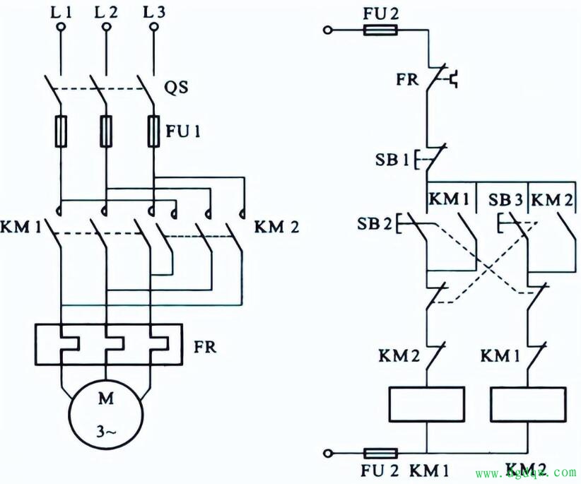 一、自锁回路的接线 自锁回路的实现原理: 接触器吸合后,其常开辅助触点(也称为自锁触点)闭合,形成一条新的电流路径。 这条新路径绕过启动按钮,直接连接电源和接触器线圈,从而保持接触器持续吸合。 当需要停止时,只需按下停止按钮,切断电流,接触器便释放,电路断开。 二、互锁回路的接线 互锁回路,又称为联锁控制,旨在确保在同一时间内,两个或多个接触器回路中只有一个接触器能够工作,以避免因两个或多个接触器同时动作而导致的短路或设备损坏。 互锁回路的典型应用:电动机的正反转控制。 传统互锁回路的局限性: 在传统的电动机正反转控制电路中,为了确保正转和反转接触器(如KM1和KM2)不会同时闭合,通常采用接触器常闭触点进行互锁。然而,这种设计存在操作上的不便,即在切换方向前必须先按下停止按钮,使当前工作的接触器释放,才能启动另一方向的接触器。 优化方案:双重互锁控制 为了克服传统互锁回路的不足,引入了双重互锁控制。这种控制方式不仅利用接触器的常闭触点进行电气互锁,还通过复式按钮实现机械互锁。 双重互锁控制电路的工作原理: 每个方向的控制按钮都包含一对常闭触点和一对常开触点。 当按下正转按钮时,其常开触点闭合,使正转接触器KM1吸合,同时其常闭触点断开,防止反转接触器KM2吸合。 反转控制按钮同理,通过其常开和常闭触点控制反转接触器KM2,并与正转控制形成互锁。 此外,接触器KM1和KM2的常闭触点也相互串联在对方的控制电路中,形成电气互锁。 这种双重互锁设计确保了无论是电气上还是机械上,正转和反转接触器都不会同时闭合,大大提高了电路的安全性和可靠性。 综上所述,交流接触器的自锁回路和互锁回路在电气控制系统中扮演着重要角色。通过合理的接线方式和优化设计方案,可以确保电路的稳定运行和设备的安全使用。 |