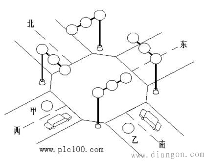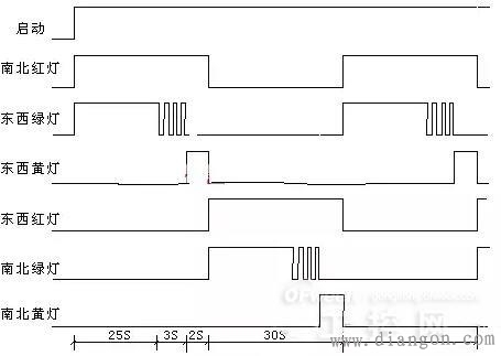 控制开关 信号灯受启动及停止按钮的控制,当按动启动按钮时,信号灯系统开始工作,并周而复始地循环工作,当按动停止按钮时,系统将停止在初始壮态,即南北红灯亮,禁止通行;东西绿灯亮,允许通行。 控制要求 1、北红灯亮维持30秒,在南北红灯亮的同时,东西绿灯也亮,并维持25秒,到25秒时,东西方向绿灯闪,闪亮3秒后,绿灯灭。在东西绿灯熄灭的同时,东西黄灯亮,并维持2秒,到2秒时,东西黄灯灭,东西红灯亮。同时,南北红灯熄灭,南北绿灯亮。 2、西红灯亮维持30秒。南北绿灯亮维持25秒,然后闪亮3秒,再熄灭。同时南北方向黄灯亮,并维持2秒后熄灭,这时南北红灯亮,东西绿灯亮。 接下去周而复始,直到停止按钮被按下为止。 信号灯动作系统可用图1状态图表示。