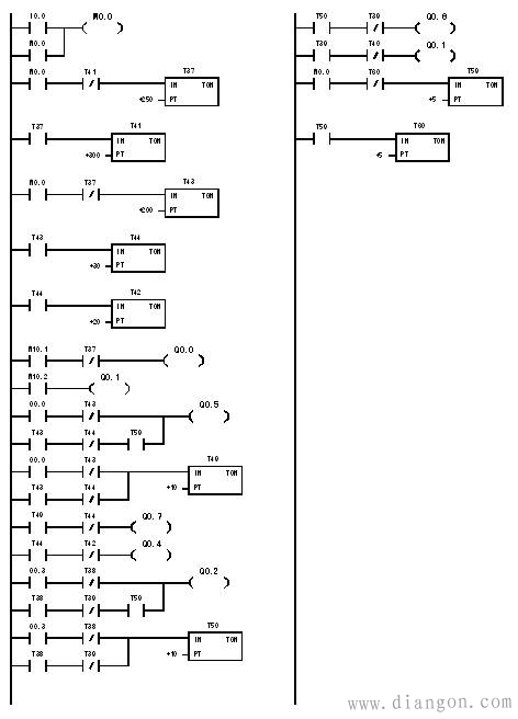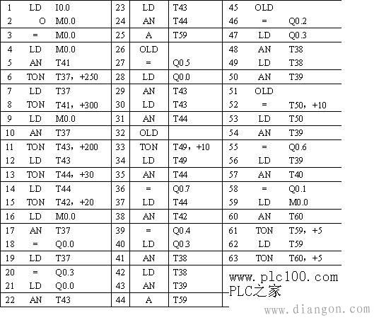 在本文中,我们采用步进梯形指令单流程编程实现,其状态转移图如图3所示。由图可知,我们把东西和南北方向信号灯的动作视为一个顺序动作,每一个时序同时有两个输出,一个输出控制东西方向的信号灯,另一个输出控制南北方向的信号灯。 状态转移图对应的步进梯形图如图4所示,现简单分析一下工作原理。当启动按钮SB1按下时,X0接通,S0置1,系统进入S0状态,驱动Y6、Y0,使南北红灯及东西绿灯同时亮,Y0接通,状态转移条件满足,系统将转移到S20状态,在S20状态下,Y6、Y0仍被驱动,即南北方向的红灯及东西方向的绿灯继续亮,同时驱动定时器T0,定时器的设定时间为25秒,25秒后,状态转移到S21,在S21状态下,Y6继续保持,但Y0受控于M1,而M1是由两个定时器T6和T7控制,T6、T7组成一个1秒的震荡器,即东西方向的绿灯闪亮。在本状态下,同时也驱动定时器T1,定时时间为3秒,3秒时间到,状态转移到S22,在S22状态下,Y6仍然被驱动,南北方向红灯继续亮,同时驱动T2、Y1,东西方向的绿灯灭,Y1口驱动的是东西方向的黄灯,故东西方向的黄灯亮,绿灯停。T2的定时时间为2秒,2秒时间到,状态转移到S23,在S23状态下,同时驱动Y2、Y4及T3,东西方向的红蛋亮,南北方向的绿灯亮,T3的定时时间为25秒,25秒时间到,状态转移到S24。在S24状态下,驱动Y2、T4,东西方向的红灯继续亮,而南北方向的绿灯驱动口Y4受控于M1,M1是震荡周期为1秒的震荡器,故南北方向的绿灯闪亮。T4的定时时间是3秒,3秒后,状态转移到S25。在S25状态下,同时驱动Y2、Y5及T5,即东西方向的红灯、南北的黄灯亮,T5定时器的定时时间为2秒,2秒时间到,定时器的定时时间到,T5的触点接通,状态又重新转移到S0。即南北方向的红灯、东西方向的绿灯亮,系统将重复上述的动作顺序,周而复始的继续工作。当停止按钮SB2被按下时,软继电器M0接通,其常闭触点M0断开,系统执行一周后,将停留在S0状态,及保持南北方向的红灯、东西方向的绿灯亮。 PLC控制交通灯梯形图 一、控制系统实现目标 用PLC构成交通灯控制系统