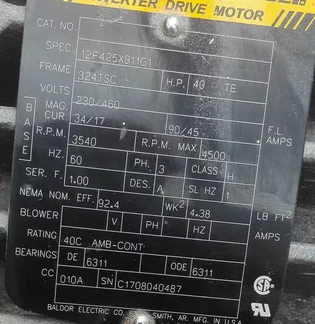 身为资深电工你能看懂这个铭牌吗?同时能准确地表述代表是什么意思吗?不是小七调侃大家,很多工友可能工作许久都看不懂这个电机铭牌! 电机铭牌如下(共有2张铭牌): ▲第一张 ▲ 第二张 我们一起来看看电友的解答 Answer 电友A: 60HZ的时候电压230V/460V,最大速度4500转,常规转速3540转,功率3匹。50HZ的时候电压190V/380V-415VV,最大速度4500转,常规转速2940转,功率3匹。 电友B: 中华民族经历长达14年的浴血奋战取得了最后的胜利今天,是“九一八”事变89周年让我们翻开历史的书卷铭记这段不可忘却的过去。 60HZ下,电压230V和460V分别对应的额定电流(F.L amps)90A和45A,空载电流(MAG. CUR)分别为34A和17A; 电友C:这电机美国的,引出线9根,都是星型接法的190V两路并联,380-415V一路输入它有个星型接点是在内部短接了的。 电友C: 这电机美国的,引出线9根,都是星型接法的190V两路并联,380-415V一路输入它有个星型接点是在内部短接了的。 电友D: 这台电机功率较大,满载电流(F.L.AMPS)108/54-51,108是230V供电电流,斜杠后面是460V供电电流,那个PH是三相(上面一位大神我告诉你:HP是马力缩写,PH是相数缩写);前面的MAG.CUR应该是无载电流(或者称呼激磁电流、空载电流),该电机应该是27.5KW~30KW左右的电机。 |