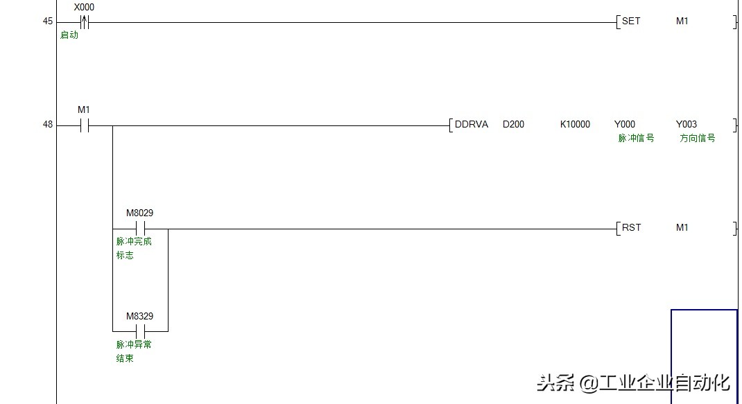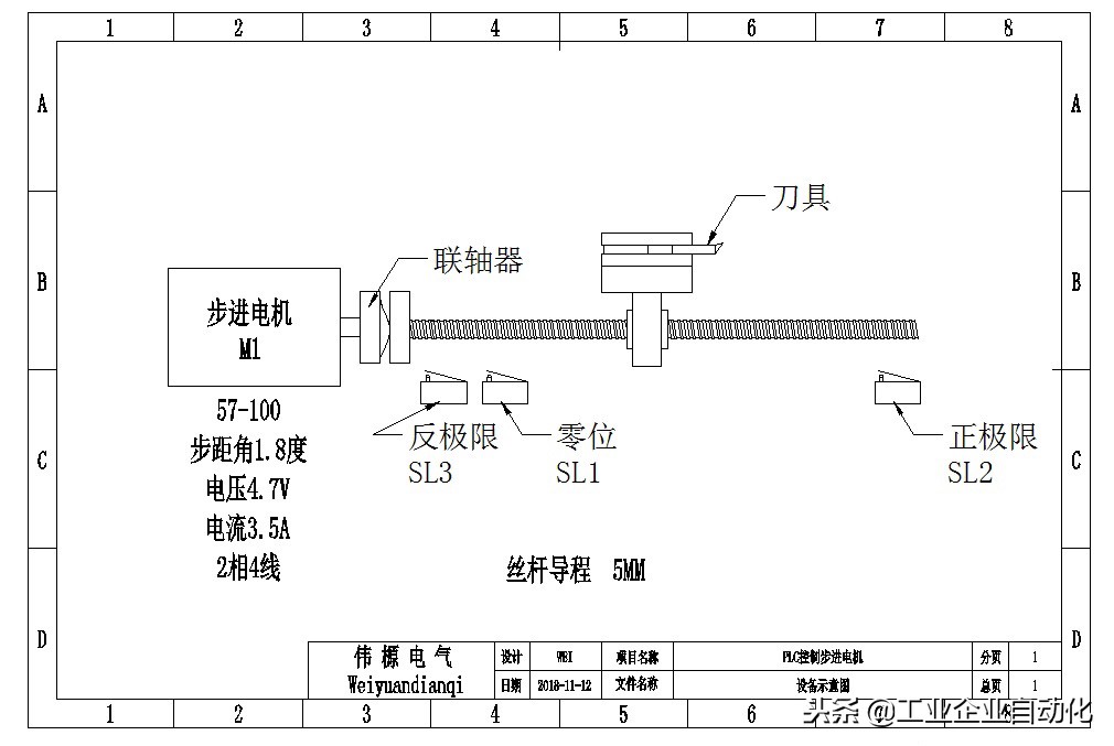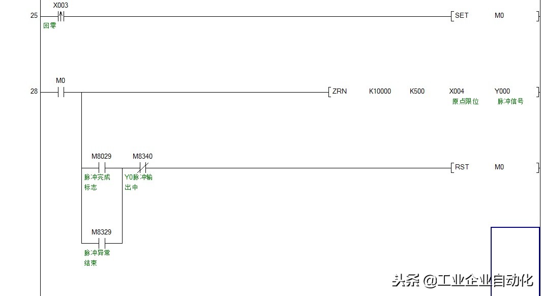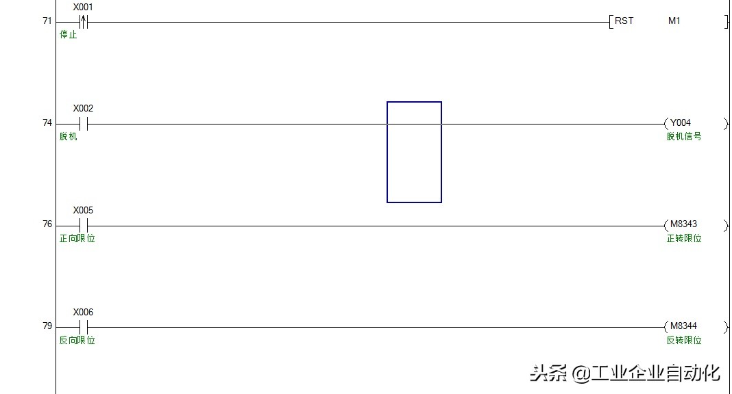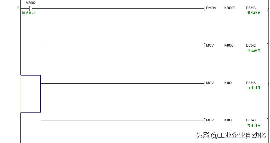 电气原理图 输入输出端子功能 X0 启动 X1 急停 X2 脱机运行 X3 回零 X4 原点限位 X5 正转限位 X6 反转限位 Y0 脉冲输出端子 Y3 方向端子 Y4 脱机端子 已知条件程序要求首先启动设备时,按动“原点回归”按钮将刀具归为零位,按动“启动”按钮,将刀具定位到一个可以通过触摸屏设定距离的可变位置,此刀具有正向及反向极限限位功能。 步进电机开关设置将细分设定为8,对应开关S1关闭,S2打开,S3关闭 电流设定为3.5A,对应开关S4关闭,S5关闭,S6关闭。 程序实例参数设定 回原点程序 D200数值由触摸屏换算距离后设定,D200数值=(移动距离/5)X1600 绝对位置定位 停止及限位程序 |