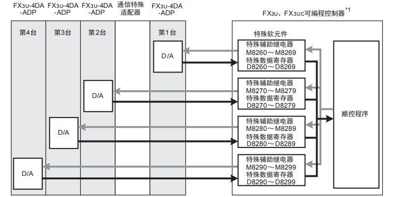 FX3U-4DA-ADP(4通道模拟量输出) 功能概要1) FX3S可编程控制器上只能连接1台4DA-ADP。 FX3G、FX3GC可编程控制器上最多可以连接2台*14DA-ADP。 FX3U、FX3UC可编程控制器上最多可以连接4台4DA-ADP。 (包括其它模拟量功能扩展板和模拟量特殊适配器) 2) 各通道中可以电压输出、电流输出。 3) 各通道的D/A转换值被自动输出到FX3S、FX3G、FX3GC、FX3U、FX3UC可编程控制器的特殊数据寄存器中。 端子排列FX3U-4DA-ADP的端子排列如下所示。 端子排图 模拟量输出接线 模拟量输出在每个ch(通道)中都可以使用电压输出、电流输出。 *2. FX3S、FX3G、FX3U可编程控制器(AC电源型)时,可以使用DC24V供给电源。 *3. 请将屏蔽线在信号接收侧进行单侧接地。 D/A转换数据的写入概要1) 输入的数字值被转换成模拟量值,并输出。 2) 通过向特殊软元件写入数值,可以设定输出保持。 3) 依照从基本单元开始的连接顺序,分配特殊软元件,每台分配特殊辅助继电器、特殊数据寄存器各10个。 . FX3U、FX3UC可编程控制器 从最靠近基本单元处开始,依次数第1台、第2台……。但是,高速输入输出特殊适配器以及通信特殊适配 器、CF卡特殊适配器不包含在内。 特殊软元件一览连接4DA-ADP时,特殊软元件的分配如下所示。 输出模式的切换 FX3U、FX3UC可编程控制器 编写模拟量转换(D/A)数据输出的基本程序例子 下面的程序是设定第3台*1的通道1为电压输出、通道 2为电流输出,并将D/A转换输出的数字值分别设定为 D100、D101。 用人机界面或者顺控程序,向D100、D101输入模拟量输出的指定数字值。 |