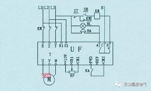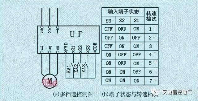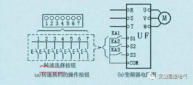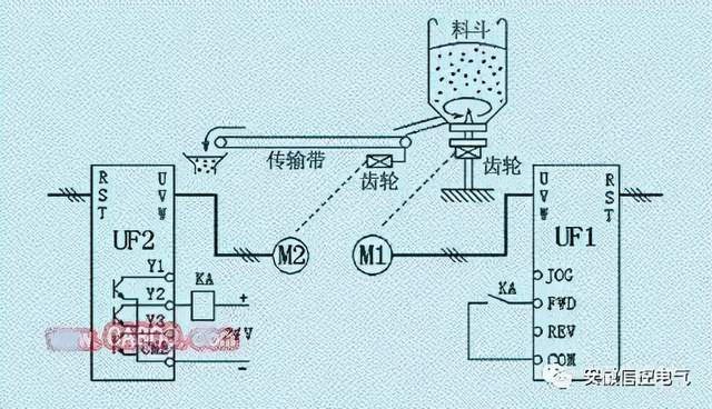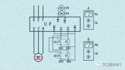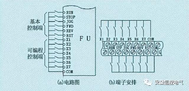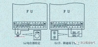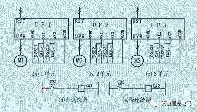 导读: 虽然每个变频器的设置都不一样,但原理都是相同的。大家多实践,早日成为变频器高手。 变频器运行的控制信号也叫操作指令,如起动、停止、正转、反转、点动、复位等。 和频率给定方式类似, 变频器操作指令的输入方式也有: (1) 键盘操作 即通过面板上的键盘输入操作指令。大多数变频器的面板都可以取下, 安置到操作方便的地方, 面板和变频器之间用延长线相联接, 从而实现了距离较远的控制, 如图1所示。 图1 面板操作 图2 外接输入端子 由于外部的开关信号可以在远离变频器的地方来进行操作,因此,不少变频器把这种控制方式称为“远控”或“遥控”操作方式。 变频器在出厂时,设定的都是键盘操作方式,用户如需要采用外接输入控制,在使用前必须通过功能预置进行选择。 1.2 变频器对外接输入端子的安排 外接输入控制端接受的都是开关量信号,所有端子大体上可以分为两大类: (1) 基本控制输入端 如运行、停止、正转、反转、点动、复位等。这些端子的功能是变频器在出厂时已经标定的, 不能再更改。 (2) 可编程控制输入端 由于变频器可能接受的控制信号多达数十种,但每个拖动系统同时使用的输入控制端子并不多。为了节省接线端子和减小体积,变频器只提供一定数量的“可编程控制输入端”,也称为“多功能输入端子”。其具体功能虽然在出厂时也进行了设置,但并不固定,用户可以根据需要进行预置。常见的可编程功能如多档转速控制、多档加/减速时间控制、升速/降速控制等; 例如,艾默生TD3000系列变频器的多功能输入端子有8个(X1~X8)。而可以预置的功能有33种;安川CIMR-G7A变频器的多功能输入端子有10个(S3~S12),而可以预置的功能多达78种。 2 常用输入控制端的应用举例 2.1 升速、减速功能 (1) 功能含义 变频器的外接开关量输入端子中,通过功能预置,可以使其中两个输入端具有升速和降速功能,称之为“升、降速(UP DOWN)控制端”。 如图3所示,假设:将X1预置为升速端,X2预置为降速端。则: 图3 外接升、降速控制 当KA1闭合时,X1得到信号,变频器的输出频率上升;KA1断开时,输出频率保持(如需要,也可以不保持)。 当KA2闭合时,X2得到信号,变频器的输出频率下降;KA2断开时,输出频率保持(如需要,也可以不保持)。 升速控制端和降速控制端必须同时预置,如果只预置其中一个,则无效。 利用外接升、降速控制信号对变频器进行频率给定时,属于数字量给定,控制精度较高。 (2) 应用举例 (a)代替外接电位器给定 在变频器的外接给定方式中,人们习惯于使用电位器来进行频率给定,如图4(a)所示。 图4 电位器给定与升、降速端子给定 但电位器给定有许多缺点,诸如: ·电位器给定是电压给定方式之一,属于模拟量给定,给定精度较差; ·电位器的滑动触点容易因磨损而接触不良,导致给定信号不稳定,甚至发生频率跳动等现象; ·当操作位置与变频器之间的距离较远时,线路上的电压降将影响频率的给定精度。同时,也较容易受到其他设备的干扰。 利用升、降速端子来进行频率给定时,只需接入两个按钮开关即可,如图4(b)所示。其优点是十分明显的: ·升、降速端子给定属于数字量给定,精度较高; ·用按钮开关来调节频率,非但操作简便,且不易损坏; ·因为是开关量控制,故不受线路电压降等的影响,抗干扰性能极好。 因此,在变频器进行外接给定时,应尽量少用电位器,而以利用升、降速端子进行频率给定为好。 (b) 两处升、降速控制 在生产实际中,常常需要在两个或多个地点都能对同一台电动机进行升、降速控制。在大多数情况下,这是通过外接控制来实现的。 ·电路的构成 如图5所示,SB1和SB2是一组升速和降速按钮,安装在控制盒CA内,由“频率表”FA显示其运行频率;SB3和SB4是另一组升速和降速按钮,安装在另一个控制盒CB内,由“频率表”FB显示其运行频率。控制盒CA和CB分别放置在两个不同的地方。 图5 两地升、降速控制 SB1与SB3并联,接在X1和COM之间,用于控制升速;SB2与SB4并联,接在X2和COM之间,用于控制降速。 l 工作方式 按下控制盒CA上的SB1或控制盒CB上的SB3,都能使频率上升,松开后频率保持;反之,按下控制盒CA上的“SB2”或控制盒CB上的“SB4”,都能使频率下降,松开后频率保持。从而实现了在不同的地点进行升速或降速控制。 依此类推,还可以实现多处控制。基本原则是:所有控制频率上升的按钮开关都并联,所有控制频率下降的按钮开关也都并联就可以了。 (c) 手动同步控制电路 在纺织、印染以及造纸机械中,根据生产工艺的需要,往往划分成许多个加工单元,每个单元都有各自独立的拖动系统,如图6所示。在这种情况下,总是要求被加工物在各单元的线速度保持一致: v1=v2=v3 图6 多单元同步运行 显然,如果后面单元的线速度低于前面,将导致被加工物的堆积;反之,如果后面单元的线速度高于前面,将导致被加工物的撕裂。因此,要求各单元的运行速度能够步调一致,即实现同步运行。 对手动同步控制的要求如下: 首先,各单元要能够同时升速和降速,进行统调; 其次, 在必要时,每个单元又能够单独地进行微调。 今以三个单元的同步为例,控制电路如图7所示,工作过程如下: ·统调 统调的控制电路如图7(d)和图7(e)所示: 图7 手动多单元同步控制 按下SB1,继电器KA1得电,其触点分别将各变频器的X1-COM接通,各单元电动机同时升速; 按下SB2,继电器KA2得电,其触