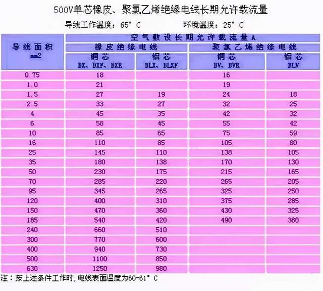 一、综述 铜芯线的压降与其电阻有关。 其电阻计算公式: 20℃时:17.5÷截面积(平方毫米)=每千米电阻值(Ω) 75℃时:21.7÷截面积(平方毫米)=每千米电阻值(Ω) 其压降计算公式(按欧姆定律):V=R×A 线损是与其使用的压降、电流有关。 其线损计算公式: P=V×A P-线损功率(瓦特) V-压降值(伏特) A-线电流(安培) 二、铜芯线电源线电流计算法 1平方毫米铜电源线的安全载流量--17A。 1.5平方毫米铜电源线的安全载流量--21A。 2.5平方毫米铜电源线的安全载流量--28A。 4平方毫米铜电源线的安全载流量--35A 。 6平方毫米铜电源线的安全载流量--48A 。 10平方毫米铜电源线的安全载流量--65A。 16平方毫米铜电源线的安全载流量--91A 。 25平方毫米铜电源线的安全载流量--120A。 单相负荷按每千瓦4.5A(COS&=1),计算出电流后再选导线。 三、铜芯线与铝芯线的电流对比法 2.5平方毫米铜芯线等于4平方毫米铝芯线 4平方毫米铜芯线等于6平方毫米铝芯线 6平方毫米铜芯线等于10平方毫米铝芯线 <10平方毫米以下乘以五> 即: 2.5平方毫米铜芯线=<4平方毫米铝芯线×5> 20安培=4400千瓦; 4平方毫米铜芯线=<6平方毫米铝芯线×5> 30安培=6600千瓦; 6平方毫米铜芯线=<10平方毫米铝芯线×5> 50安培=11000千瓦 土方法是铜芯线1个平方1KW,铝芯2个平方1KW.单位是平方毫米 就是横截面积(平方毫米) 电缆载流量根据铜芯/铝芯不同,铜芯你用2.5(平方毫米)就可以了,其标准: 0.75/1.0/1.5/2.5/4/6/10/16/25/35/50/70/95/120/150/185/240/300/400... 还有非我国标准如:2.0 铝芯1平方最大载流量9A,铜芯1平方最大载流量13.5A 二点五下乘以九,往上减一顺号走。 三十五乘三点五,双双成组减点五。 条件有变加折算,高温九折铜升级。 穿管根数二三四,八七六折满载流。 “二点五下乘以九,往上减一顺号走”说的是2.5mm’及以下的各种截面铝芯绝缘线,其载流量约为截面数的9倍。如2.5mm’导线,载流量为2.5×9=22.5(A)。从4mm’及以上导线的载流量和截面数的倍数关系是顺着线号往上排,倍数逐次减l,即4×8、6×7、10×6、16×5、25×4。 “三十五乘三点五,双双成组减点五”,说的是35mm”的导线载流量为截面数的3.5倍,即35×3.5=122.5(A)。从50mm’及以上的导线,其载流量与截面数之间的倍数关系变为两个两个线号成一组,倍数依次减0.5。即50、70mm’导线的载流量为截面数的3倍;95、120mm”导线载流量是其截面积数的2.5倍,依次类推。 “条件有变加折算,高温九折铜升级”。上述口诀是铝芯绝缘线、明敷在环境温度25℃的条件下而定的。若铝芯绝缘线明敷在环境温度长期高于25℃的地区,导线载流量可按上述口诀计算方法算出,然后再打九折即可;当使用的不是铝线而是铜芯绝缘线,它的载流量要比同规格铝线略大一些,可按上述口诀方法算出比铝线加大一个线号的载流量。如16mm’铜线的载流量,可按25mm2铝线计算。 2.5平方毫米铜电源线的安全载流量--28A。 4平方毫米铜电源线的安全载流量--35A 。 6平方毫米铜电源线的安全载流量--48A 。 10平方毫米铜电源线的安全载流量--65A。 16平方毫米铜电源线的安全载流量--91A 。 25平方毫米铜电源线的安全载流量--120A。 如果是铝线,线径要取铜线的1.5-2倍。 如果铜线电流小于28A,按每平方毫米10A来取肯定安全。 如果铜线电流大于120A,按每平方毫米5A来取。 导线的截面积所能正常通过的电流可根据其所需要导通的电流总数进行选择,一般可按照如下顺口溜进行确定: 十下五,百上二, 二五三五四三界, 柒拾玖五两倍半, 铜线升级算。 给你解释一下,就是10平方以下的铝线,平方毫米数乘以5就可以了,要是铜线呢,就升一个档,比如2.5平方的铜线,就按4平方计算.一百以上的都是截面积乘以2, 二十五平方以下的乘以4, 三十五平方以上的乘以3, 柒拾和95平方都乘以2.5,这么几句口诀应该很好记吧, 十下五,百上二 二五,三五,四三界 七十,九五二倍半 裸线加一半,铜线升级算 穿管,高温八,九折 说明:“十下五”指导线截面在10平方毫米及以下,每1平方毫米安全电流为5安培。 “百上二”指导线截面在100平方毫米以上,每1平方毫米安全电流为2安培。 “二五,三五,四三界”指导线截面在25平方毫米及16平方毫米,每1平方毫米安全电流为4安培。导线截面在35平方毫米和50平方毫米,每1平方毫米安全电流为3安培。 “七十,九五二倍半”指导线截面在70平方毫米和95平方毫米,每1平方毫米安全电流为2.5安培。 “裸线加一半,铜线升级算”指同截面的裸线,可按绝缘导线乘以1.5倍计算安全电流。同截面的铜导线按铝导线大一线号等级计算安全电p=ui42000/220=191A纯电阻性元件。建议用150平方电缆。 1平方塑料绝缘导线安全载流值: 明线──17安, 穿钢管:二根──12安,三根──11安,四根──10安, 穿塑料管:二根──10安,三根──10安,四根──9安。 护套线:二芯──13安,三芯四芯──9.6安。 橡胶绝缘线;明线──18安,穿钢管:二根──13安,三根──12安,四根──11安 说明:只能作为估算,不是很准确。 另外如果按室内记住电线6平方毫米以下的铜线,每平方电流不超过10A就是安全的,从这个角度讲,你可以选择1.5平方的铜线或2.5平方的铝线。 10米内,导线电流密度6A/平方毫米比较合适,10-50米,3A/平方毫米,50-200米,2A/平方毫米,500米以上要小于1A/平方毫米。从这个角度,如果不是很远的情况下,你可以选择4平方铜线或者6平方铝线。 如果真是距离150米供电(不说高楼),一定采用4