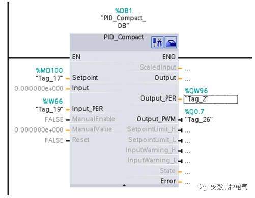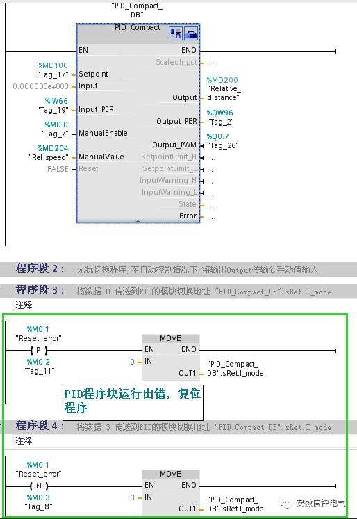 如何使用S7-1200的PID功能 客户问题1:客户使用S7-1200 PID程序块,使用的反馈值是 INPUT ,启动自整定后出现输入值超出设定范围错误,无法启动自整定功能。 解答: 经过与用户多次交流,发现问题是存储器地址冲突: 客户使用了INPUT输入变量,经过模拟量输入处理程序标定上限为:100.0,下限为:0.0。分配的存储地址是MD516,在客户的程序内容还使用了MW516 ,MD518地址。导致地址冲突,修改MD516数据,使MD516存储器保存的数据大于100.0,当启动自整定时,出现输入值超出设定范围错误。 扩展知识 1. MD516 包括4个字节: MB516 ,MB517,MB518,MB519,当使用MD516寄存器,其他程序不能使用MB516,MB517,BM518,MB519。否则,导致地址冲突,保存数据被修改或丢失。在S7-200的M区和V区;S7-300/S7-400的M区都需要注意此问题。 2. S7-1200 PID的两个反馈数据 INPUT/INPUT-PER区别,以及与Setpoint的关系。 INPUT是现场仪表测量数据,经过程序标定转换成实际工程量数据。数据类型是实数。 INPU-PER是现场仪表数据直接经过模拟量通道进行测试,未进行数据标定,数据类型是WORD。可以通过PID组态直接进行数据标定,转换成实际工程量。推荐使用此方法。 Setpoint:设定值,PID系统通过调解输出设备,使反馈值与设定值相等。设置范围即是反馈值标定的上下限。 3. Output,Output_PER, Output-PWM区别, 这三个信号全是输出信号,Output与Output_Per是一组, Output输出是一个百分比数,即0%~100%,指控制设备全关或全开。 Output_Per直接输出至模拟量通道,输出整数0~27648 Output_Pwm输出是脉宽信号,开关量输出,与上面两个信号不相同,单独使用。 建议的组态过程: 如图1 程序块 图1 如图2 基本参数配置 反馈与输出配置 图2 如图3 反馈数据标定 图3 客户问题2:如何启动S7-1200的自整定,客户的设定值与反馈值过于接近,无法使用“启动自整定” 解答: 当您的系统各部分已经准备完毕,可以使用自整定,自整定功能只是系统将自动优化或计算PID参数,是调试的一种方法,正常运行时,不必运行自整定调试程序。 方法如下: 第一步:启动测试 图4 第二步:设定值设定 首次启动自调节: 建议第一次自整定时,一定要使用“启动首次自整定”,可以避免系统出现发散现象,无法正常工作 设定值要求: 设定值 – 反馈值(已标定) > 0.3 * 反馈值上限 – 反馈值下限制 和 设定值 – 反馈值(已标定) > 0.5 * 设定值 运行自整定:微调,校验PID参数,在完成首次自整定后,建议启动运行自整定,对PID参数进行再次检验。 设定值要求: 设定值 – 反馈值(已标定) <0.3 * 反馈值上限 – 反馈值下限制 和 设定值 – 反馈值(已标定) < 0.5 * 设定值 第三步 启动自整定,见图5 图5 第4步 完成状态 图6 以上就是用户在现场实际情况中遇到的两个问题,不过,对PID来讲,我又做了如下的问题的扩展,希望对大家有进一步的帮助。 问题:S7-1200 PID正常运行的情况下,出现错误,如何恢复。 解答: 在程序块 PID_Compact内,管角Error=1时,指示当前PID运行状态出错。要重新启动PID功能,需要修改PID模式-PID_CompactDB.sRet.i_Mode。来恢复PID运行,在复位PID之前,需要确认错误已经消除。其他方法无法重新启动PID,包括Reset功能也不能重置。具体程序如图7 图7 西门子的PID还是很强大的 自整定后非常稳定 我有个5个加热区需要工作 其他4个区用自己做的PID 可以正常工作 但是有一个区却始终达不到使用要求 温度的偏差在20度左右 然后用S71200的 PID 功能块自整定以后效果非常好 温差在0.5度以内。 问题就是当模块的输入值超限以后 PID工作块会报故障 复位故障,重新上电以后也不能正常工作 。 这个时候,你需要做一个自己复位的小程序 复位下功能块就可以了 。 当有故障时自动复位功能块,但是这个时候功能块的状态值会变成0,状态为0的时候加热是不会工作的。 要自己做个小程序 当状态字的值为零时,把3赋值给以下地址"PID_Compact_DB_1".sRet.i_Mode就OK了 做了这个以后我的加热功能PID 再也没有出过问题PID_Compact_1.sRet.i_Mode |