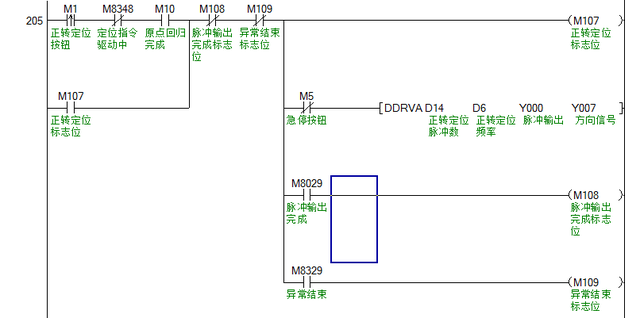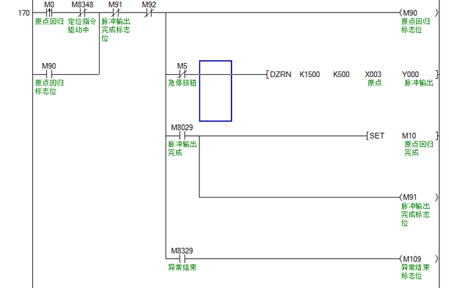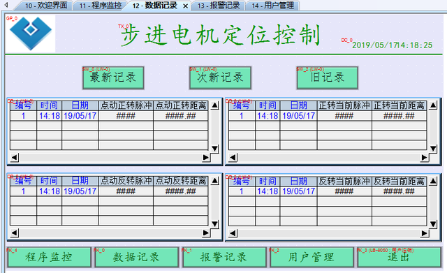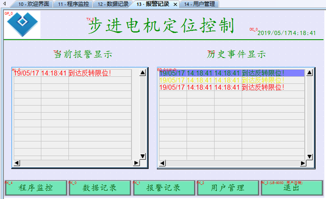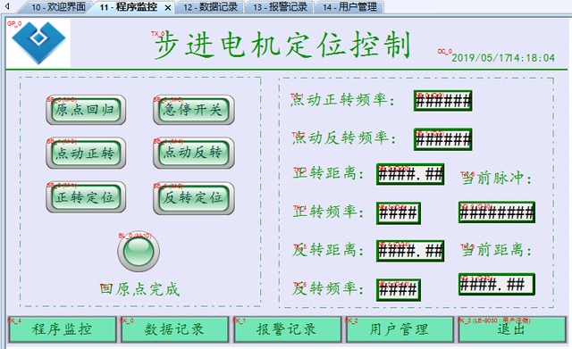 首先先看一下控制要求,假定:电机转一圈800个脉冲,电机转一圈0.2mm距离。 1、按下正转点动按钮,步进电机正转运行,按下反转点动按钮,步进电机反转运行。 2、在执行绝对定位之前,首先要执行一次原点回归指令,原点回归完成有指示灯信号。 3、原点回归完成后,再按下正转定位按钮,步进电机正转运行指定距离自动停止(距离的长度由绝对定位指令的脉冲数决定)。按下反转定位按钮,步进电机反转运行指定距离自动停止。 在设计PLC和HMI程序时的功能要求说明如下: 1、设计PLC和触摸屏程序,所有按钮/开关、回原点完成指示灯均为触摸屏控制。 2、在触摸屏上能够指定点动正反转频率,指定正反转定位频率和距离(注意:是距离,不是脉冲数)。此外,还要求能监控当前脉冲和当前距离的功能。 3、对于每次执行点动正反转、正反转定位,要求做资料取样和历史数据记录,时间为3天,可筛选日期查看数据记录。 4、丝杆设有正反转限位,当触及限位时需要报警,要求设计当前报警显示和历史报警记录。 5、要求添加用户等级密码功能,分技术员和管理员,技术员可监控程序、查看数据记录和报警记录,而管理员具有全部权限,还具有在用户管理页面重置密码的权限。 对于这样的一个控制,我们应该怎么去做?先做什么再做什么?下面我们来看一下。 第一,设计PLC的控制程序,下载程序到PLC。 第二,设计HMI的过程画面。 第三,设置好通讯参数,下载HMI程序到触摸屏。 第四,将PLC和HMI用通讯线连接起来,成功通信上之后即可进行HMI通讯控制。 下面为FX3UPLC的控制程序: 下面为威纶通触摸屏的画面设计: PLC和HMI程序就是这些,为了助力大家更好学习三菱相关知识,拥有更加丰富的项目实战经验,技成培训特此推出新课《激光破皮实战项目》,该课程为大家准备激光破皮实战项目项目,接触以三菱FX3U和威纶通MT8101IE硬件作为基础进行开发调试。干货满满,切勿错过! |
