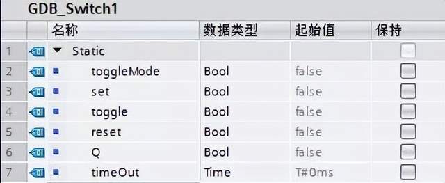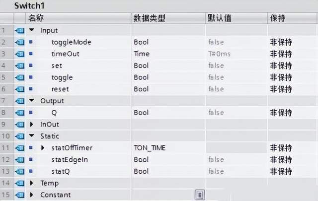 1. 设计要求: 设计一个具有一键启停功能的功能块,具有以下功能: b. 同时具有一个按钮启动的功能,按一下启动,再按不会停止。 c. 具有定时停机的功能,按照设定好的时间自动停机。 d. 具有复位功能。 2. 添加FB块,建立变量。如下图: 3. 编写程序。如下图: 4. 调用并监控。如下图: 以上数据块定义了功能块的管脚全局变量。 |