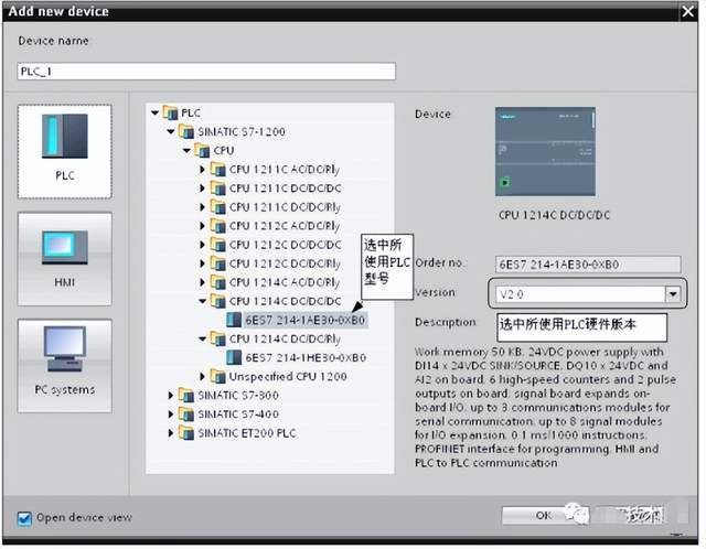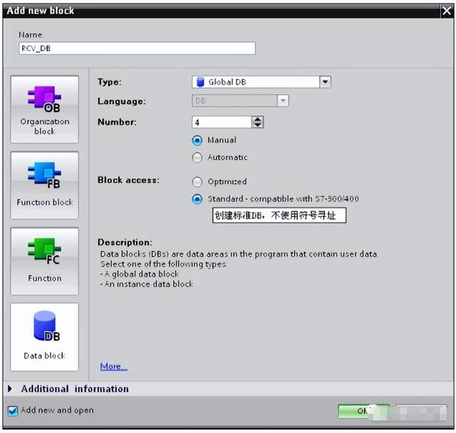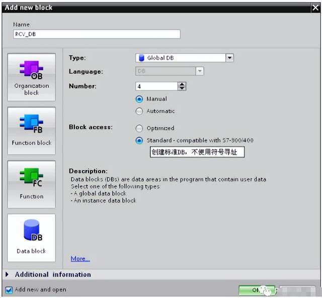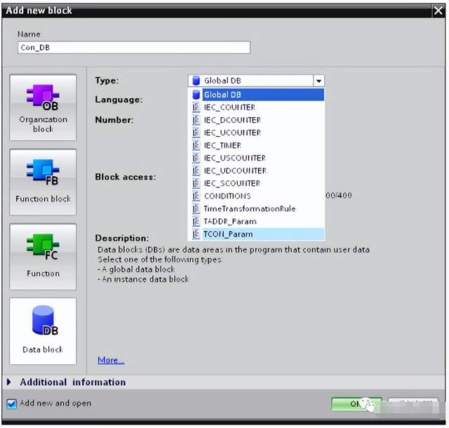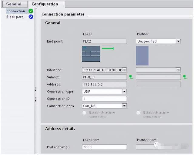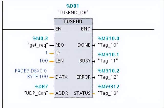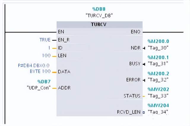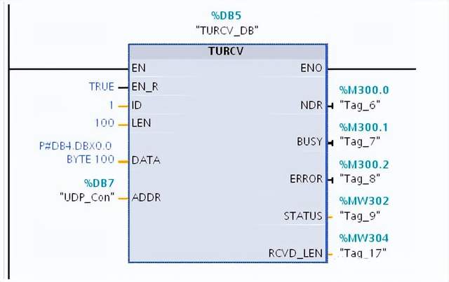 图1. 添加新设备 为了编程方便,使用 CPU 属性中定义的时钟位,定义方法如下:在 “Project tree” > “PLC_1” > “Device configuration” 中,选中 CPU ,然后在下面的属性窗口中,“Properties” > “System and clock memory” 下,将系统位定义在MB1,时钟位定义在MB0,如图2所示。时钟位我们主要使用 M0.3,它是以2Hz 的速率在0和1之间切换的一个位,可以使用它去自动激活发送任务。 图2. 系统位与时钟位 3. 为 PROFINET 通信口分配以太网地址 在 “Device View”中点击 CPU 上代表PROFINET 通信口的绿色小方块,在下方会出现PROFINET 接口的属性,在 “Ethernet addresses” 下分配IP 地址为 192.168.0.1 ,子网掩码为255.255.255.0,如图3所示。 图3. 分配IP 地址 同样方法,在同一个项目里添加另一个新设备S7-1200 CPU 并为其分配 IP 地址为192.168.0.2 4. 创建 CPU之间的逻辑网络连接 在项目树 “Project tree”>“Devices & Networks” >“Networks view” 视图下,创建两个设备的连接。用鼠标点中 PLC_1 上的PROFINET通信口的绿色小方框,然后拖拽出一条线,到另外一个PLC_2 上的PROFINET通信口上,松开鼠标,连接就建立起来了,如图4所示。 图4. 建立两个 CPU的逻辑连接 在 PLC_1 中调用并配置“TCON”、“TUSEND”、“TURCV” 通信指令 1.在 PLC_1 的 OB1 中调用“TCON” 通信指令 ① 在第一个 CPU 中调用发送通信指令,进入 “Project tree” > “ PLC_1” > “Program blocks” > “OB1” 主程序中,从右侧窗口 “Instructions” > “Communications” > “OPEN User Communications”下调用 “TCON” 指令,创建连接,如图5所示。 图5. 调用“TCON”通信指令 ② 创建DB2 分配连接参数,见图6所示 图6. 创建连接数据块 DB2(Con_DB) ③ 定义PLC_1的 “TCON”连接参数 PLC_1 的 TCON 指令的连接参数需要在指令下方的属性窗口“Properties”> “Configuration”>“Connection parameter”中设置,如图7所示。 图7. 定义 TCON 连接参数(选择UDP连接) 2.定义 PLC_1 的“TUSEND”发送通信块接口参数 ①调用 “TUSEND” 在OB1内调用 发送100个字节数据到PLC2中 进入 “Project tree” > “ PLC_1” > “Program blocks” > “OB1” 主程序中,从右侧窗口 “Instructions” > “Communications” > “OPEN User Communications”下调用 “TUSEND” 指令,,如图8所示。 图8. 调用 TUSEND ②创建并定义PLC_1的发送数据区 DB 块。 通过“Project tree”>“PLC_1”>“Program blocks”>“Add new block”,选择“Data block” 创建 DB 块,选择绝对寻址,点击“OK”键,定义发送数据区为 100个字节的数组,如图9~10所示 图9. 创建发送数据区 DB 块 注意:对于双边编程通信的 CPU ,如果通信数据区使用 DB 块,既可以将 DB 块定义成符号寻址,也可以定义成绝对寻址。使用指针寻址方式,必须创建绝对寻址的 DB 块 图10. 定义发送数据区为字节类型的数组 ③定义UDP 连接参数数据块 通过“Project tree”>“PLC_1”>“Program blocks”>“Add new block”,选择“Data block” 创建 DB 块,然后在右侧“Type”中选择“TADDR_Param”,如图11所示 图11. 创建UDP连接参数数据块 创建完DB块后,可以在DB块内,设置本地PLC所要连接设备的IP地址与端口号,如图12所示。 图12. UDP 连接详细参数 ④ 定义 PLC_1 的“TUSEND”发送通信块接口参数,如图13所示。 图13. 定义 TUSEND 接口参数 3.在 PLC_1 的OB1中调用接收指令TURCV 并配置基本参数 为了实现 PLC_1 接收来自 PLC_2 的数据,则在 PLC_1 中调用接收指令TURCV 并配置基本参数。 ①创建并定义PLC_1的接收数据区 DB 块。 通过“Project tree”>“PLC_1”>“Program blocks”>“Add new block”,选择“Data block” 创建 DB 块,选择绝对寻址,点击“OK”键,定义发送数据区为 100个字节的数组,如图14~15所示 图14. 创建接收数据区 DB 块 注意:对于双边编程通信的 CPU ,如果通信数据区使用 DB 块,既可以将 DB 块定义成符号寻址,也可以定义成绝对寻址。使用指针寻址方式,必须创建绝对寻址的 DB 块。 图15. 定义接收数据区为字节类型的数组 ②调用 “TURCV” 在OB1内调用 进入 “Project tree” > “ PLC_1” > “Program blocks” > “OB1” 主程序中,从右侧窗口 “Instructions” > “Communications” > “OPEN User Communications”下调用 “TRCV” 指令,配置接口参数,如图16所示。 图16. 调用 TURCV 指令并配置接口参数 PLC_2 编程通信 1.在 PLC_2 的 OB1 中调用“TCON” 通信指令 ① 在第一个 CPU 中调用发送通信指令,进入 “Project tree” > “ PLC_2” > “Program blocks” > “OB1” 主程序中,从右侧窗口 “Instructions” > “Communications” > “OPEN User Communications”下调用 “TCON” 指令,创建连接,如图17所示。 图17. 调用“TCON”通信指令 ② 创建DB2 分配连接参数,见图18所示 图18. 创建连接数据块 DB2(Con_DB) ③ 定义 PLC_2的 连接参数 “TCON” PLC_2 的 TCON 指令的连接参数需要在指令下方的属性窗口“Properties”> “Configuration”>“Connection parameter”中设置,如图19所示 图19. 定义 TCON 连接参数 2. 在 PLC_2 中在OB1调用“TURCV”通信指令 接收从PLC_1 发送到 PLC_2的100个字节数据 ① 创建并定义接收数据区 DB 块。 通过“Project tree”>“ PLC_2”>“Program blocks”>“Add new block” ,选择 “Data block”创建 DB 块,选择符号寻址,点击“OK”键,定义接收数据区为 100 个字节的数组,图20~21所示。 图20. 创建接收数据区 DB 块 图21. 定义接收区为 100 个字节的数组 ② 定义调用 “TURCV” 程序 图22. TURCV 块参数配置 3 在 PLC_2 中调用并配置“TUSEND”通信指令 PLC_2 将 发送100个字节数据 到 PLC_1 中,如何创建发送数据块DB3,与