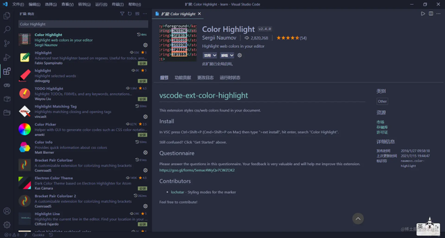 本文不做任何编辑器的比较,只是我本人日常使用 vscode 进行开发,并且比较喜欢折腾 vscode ,会到处找这一些好玩的插件,于是越攒越多,今天给大家推荐一下我收藏的 60 多个 vscode 插件,据说插件装太多,编辑器会变卡,可能是我的电脑配置还顶得住,目前并没有感觉到卡卡的。 接下来我会将会以 优化外观,功能扩展,提升编码效率,代码格式化,其它插件 几个分类来进行介绍。 注:本文只涉及插件的基本使用,也就是让你知道存在这样一种插件,以及大致了解这个插件可以做什么事,部分插件的详细配置过于复杂,有需要的小伙伴请自行冲浪。根据每个人电脑,vscode 配置,以及插件的不同,部分插件可能在你电脑上不会生效。文中提到的快捷键都是 windows 下的,其他操作系统的快捷键请自行了解。 好马用好鞍,好看的编辑器外观,可以提升程序员的编码体验,可以让开发人员的心情变好,让写 bug 更有动力。 Better Comments一款美化注释的插件,可以根据不同种类的注释,显示不同的颜色,一目了然。 安装完以后,插件会默认自带几种颜色的注释,还可以通过 vscode 的配置文件自定义任何颜色,类型的注释。具体的配置方法我给你们找好了。 Bracket Pair Colorizer / Bracket Pair Colorizer 2 这是一个找对象的插件,不是帮你们找对象啊,是帮你找到括号的另一半。目前有两个版本,Bracket Pair Colorizer 2 是增强版,具体我没有深入研究具体增强了哪些内容。而且它有挺多的设置项,反正安装完默认的配置已经够用了,感兴趣的同学自行发觉更多有趣玩法吧。 大家可以看到配对的括号是相同的颜色,并且当我选中一个括号以后,会出现一条线帮你找到它对应的另一半括号。 Highlight Matching Tag 这也是一个找对象的插件,找的是标签的对象,看我上一个插件的演示图片中,当我点击一下 html 标签,配对的标签就会出现下划线来指示你谁和谁是一对。 Chinese 让你的 vscode 变成中文,像我这种英语弱鸡才会用,大佬们略过。为什么要放在优化外观的分类里,因为我觉得中文比英文好看,安装完重启就行了。 Color Highlight 看名字就知道了,用于给我们代码中的颜色进行高亮展示的插件。可以看到下图中我设置的 css 颜色属性,直观的展示了出来。 Community Material Theme / Material Theme 修改编辑器的主题,内置很多种,我用的是 Material Theme Palenight High Contrast 这一款。安装完了以后点击 设置颜色主题 就可以了。 Material Theme Icons设置文件图标的,这个插件的长这个样子,还有很多其它修改文件图标的插件,不喜欢这一款的,大家可以自行找一找。 Error Gutters 报错的地方都有大红波浪线提示,可以说是非常的直观了。 Image preview 预览代码中图片的引用,鼠标移上去就会有小窗展示图片。 indent-rainbow 看名字就知道了,彩虹缩进,就是把代码不同的缩进展示不同的颜色。 Indenticator 当你点击一个缩进部分的时候,会出现一条白线来告诉你当前处于的缩进层级,可以更方便的查看代码结构。 Trailing Spaces 把尾随空格显示出来。 VSCode Great Icons 另一个修改文件图标的插件,我用的就是这个,相对于 Material Theme Icons 我更喜欢这个的风格,萝卜青菜可有所爱,大家各取所需。 编辑器自身的功能还是有限的,为了应付日常开发,不得不安装很多其他的软件进行辅助,不过也可以通过插件的方式引入一些常用的辅助软件,它们的功能可能没有原生的强大,但是基本上已经够用,并且是真的很方便。 AZ AL Dev Tools/AL Code Outline 用来梳理代码结构的插件,安装完后在文件图标里就会多出一个 AL OUTLINE 的选项。 为了演示我找了一个比较长,比较典型的 vue 文件,请忽略我的代码内容,专注于插件的功能, 可以看到展开第一层是极具 vue 单文件组件特点的 template,script,style。逐层展开就可以看到 dom 节点, methods 里面定义的函数等,然后点击就可以快速定位到目标所在位置,妈妈再也不用担心我全局搜啦! 注:它这个里面好像是默认展开的,应该是可以设置是否默认展开,但我没研究过,感兴趣的大佬可以深入调查一下。 Code Runner运行代码,可以在编辑器中查看结果,前端同学可以在控制台看 console.log ,还有很多其他玩法,具体使用参考此篇文章 CodeIf 在网上看到一句话,在计算机科学中只有两件难事:缓存失效和命名。哈哈哈,确实如此,当开发项目时,命名一直都是一种让人痛苦的事情。 但是命名又是开发过程中一项非常重要的事情,一个好的函数命名,能够让你瞬间明白它实现的功能,所以,每当开发过程中遇到要命名的变量、函数、类时就要冥思苦想,各种翻译。 但是,CodeIf 的出现让这个问题迎刃而解,它通过搜索 GitHub, Bitbucket, GitLab 来找到真实的使用变量名,为你提供一些高频使用的词汇。 使用时只需要选中变量名,然后 右键 选择 CodeIf 就可以跳转到网页,显示候选命名。 Color Info 查看颜色详细信息的插件,可以小窗口显示颜色值,rgb,hsl,cmyk,hex等等,可以在配置项里添加要展示的信息类型。 Code Spell Checker 检查代码中单词拼写是否正确,当单词不正常的时候,就会在下方出现波浪线进行提示,还可以自定义词典,忽略某个单词的检查等,更多用法参考下面链接。 Debugger for Chrome 这款插件是专门为前端调试开发的,很方便调试,跟谷歌的控制台是一样的功能,安装以后,无需打开浏览器的控制台就能进行断点调试。对应的还有 Debugger for Firefox,Debugger for Microsoft Edge等,其他的我没