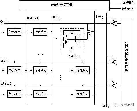 编程数据存储单元以阵列形式分布在FPGA中,编程数据存储单元阵列结构如图1所示。存储单元为5管SRAM结构, 只有一根位线。其中T管为本单元控制门,由字线控制。数据以串行方式移入移位寄存器,而地址移位寄存器顺序选中存储单元的一根字线,当某列字线为高电平时, 该列存储单元的T管导通,从而与位线接通,在写信号控制下将数据移位寄存器中一个字的数据通过各列位线写入该列存储单元。