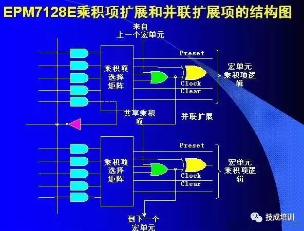 在CPLD的宏单元中,如果输出表达式的与项较多,对应的或门输入端不够用时,可以借助可编程开关将同一单元(或其他单元)中的其他或门与之联合起来使用,或者在每个宏单元中提供未使用的乘积项给其他宏单元使用。 EPM7128E乘积项扩展和并联扩展项的结构图