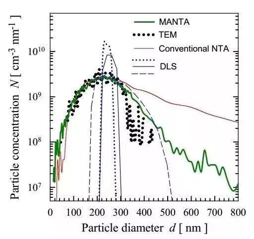 分析原理:纳米颗粒追踪分析技术, 利用光散射原理,不同粒径颗粒的散射光成像在CCD上的亮度和光斑大小不一样,依此来确定粒径尺寸; 合适浓度的样品均质分散在液体中可以得出粒径尺寸分布和颗粒浓度信息, 准确度非常高。