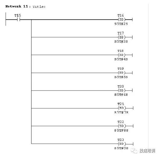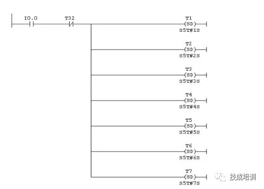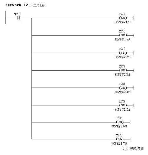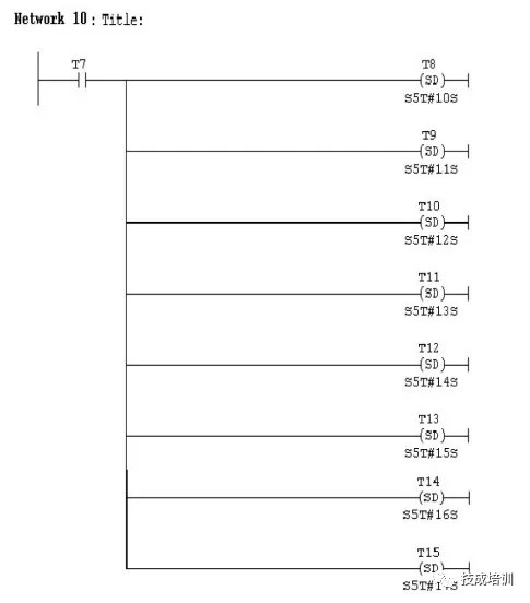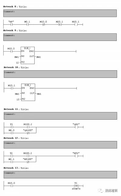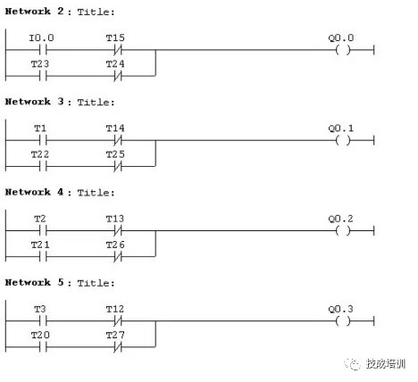 该广告屏中间8个灯管亮灭的时序为第1根亮一第2根亮一第3根 亮一... 一第8根亮,时间间隔为Is,全亮后,显示10s,再反过来从 8一7一・..一1顺序熄灭。全灭后,停亮2s,再从第8根灯管开始亮 起,顺序点是7—6—... — 1,时间间隔为Is,显小20s,再从一2—... — 8 顺序熄灭。全熄灭后,停亮2s,再从头开始运行,周而复始。参巧梯形图程序: