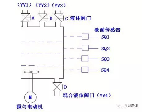 多种液体自动混合装置的PLC控制如图所示为三种液体混合装置,SQ1、SQ2、SQ3和SQ4为液面传感器, 液面淹没时接通,液体A、B、C与混合液阀由电磁阀YV1、YV2、YV3、 YV4控制,M为搅匀电动机,其控制要求如下: