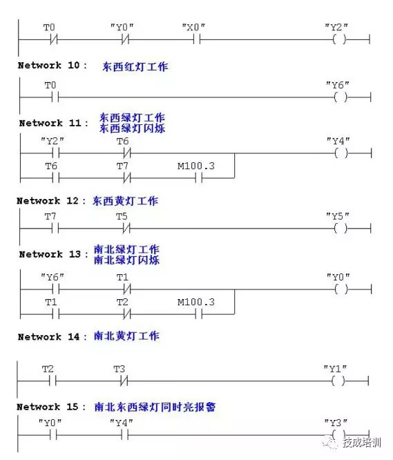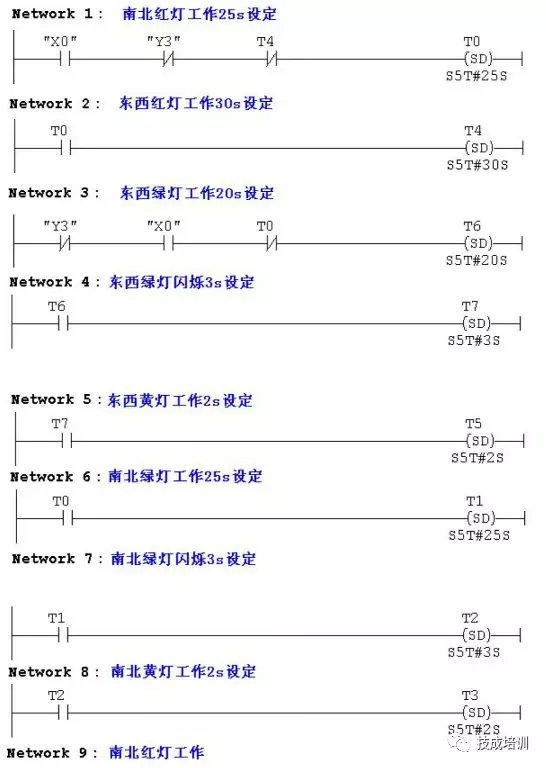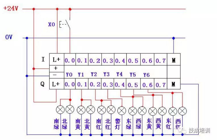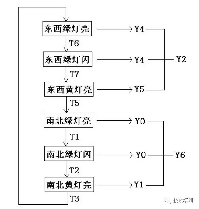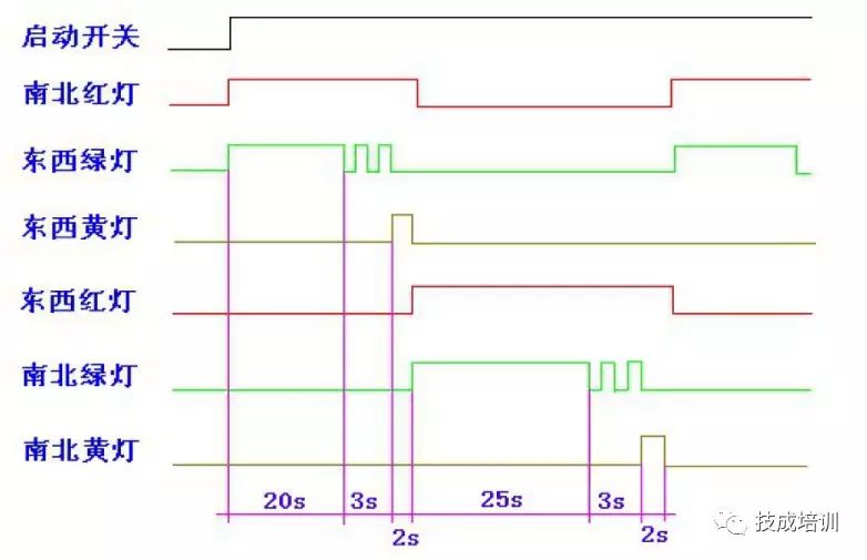 (1) 信号灯系统由一个启动开关控制,当启动开关接通时,该信号灯系 统开始工作,当启动开关关断时,所有信号灯都熄灭。 (2) 南北绿灯和东西绿灯不能同时亮。如果同时亮应关闭信号灯系统, 并立刻报警。 (3) 南北红灯亮维持25s。在南北红灯亮的同时东西绿灯也亮,并维持20s。到20s时,东西绿灯闪亮,闪亮3s后熄灭,此时,东西黄 灯亮,并维持2s。到2s时,东西黄灯熄灭,东西红灯亮。同时, 南北红灯熄灭,南北绿灯亮。 (4) 东西红灯亮维持30s。南北绿灯亮维持25s,然后闪亮3s后熄灭。同时南北黄灯亮,维持2s后熄灭,这时南北红灯亮,东西绿灯亮。 (5)以上南北、东西信号灯周而复始地交替工作状态,指挥着十字路口的交通,其时序如下图所示 二、PLC接线