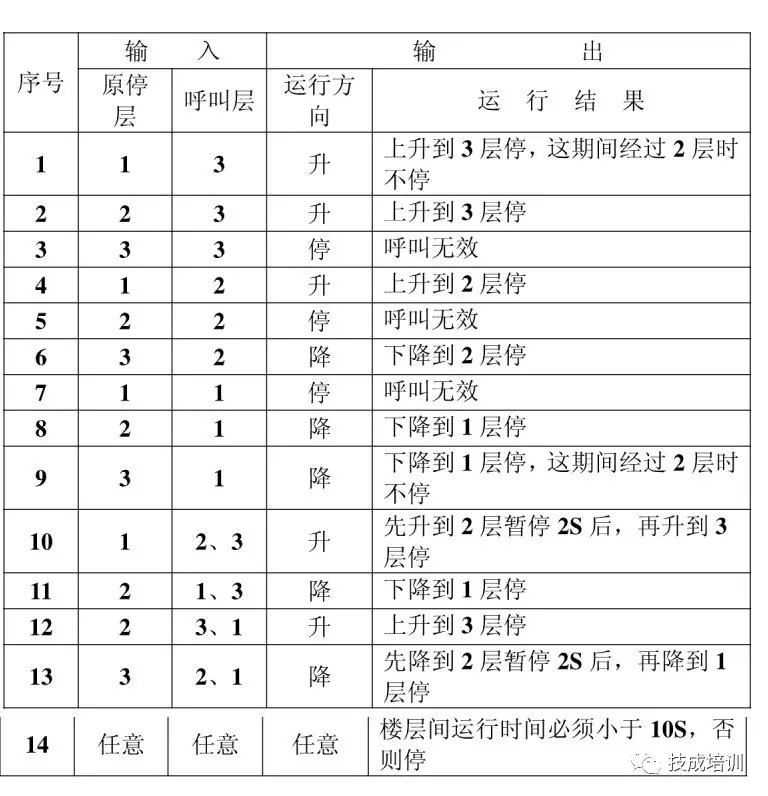 (2) 电梯箱体上升途中只响应上升呼叫,下降途中只响应下降呼叫,任何 反方向呼叫均无效,简称为不可逆响应。具体动作要求,如下表。