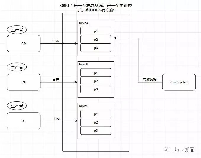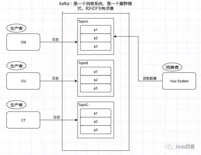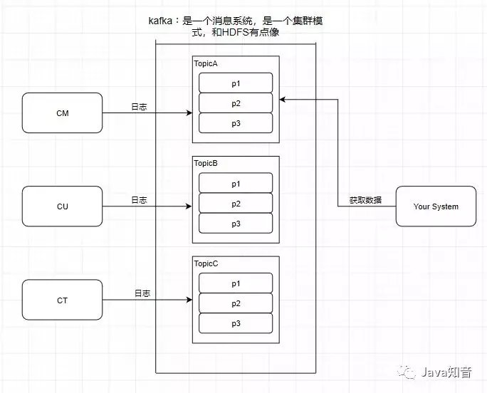 一、Kafka基础消息系统的作用 应该大部分小伙伴都清楚,用机油装箱举个例子 所以消息系统就是如上图我们所说的仓库,能在中间过程作为缓存,并且实现解耦合的作用。 引入一个场景,我们知道中国移动,中国联通,中国电信的日志处理,是交给外包去做大数据分析的,假设现在它们的日志都交给了你做的系统去做用户画像分析。 按照刚刚前面提到的消息系统的作用,我们知道了消息系统其实就是一个模拟缓存,且仅仅是起到了缓存的作用而并不是真正的缓存,数据仍然是存储在磁盘上面而不是内存。 1.Topic 主题kafka学习了数据库里面的设计,在里面设计了topic(主题),这个东西类似于关系型数据库的表 此时我需要获取中国移动的数据,那就直接监听TopicA即可 2.Partition 分区kafka还有一个概念叫Partition(分区),分区具体在服务器上面表现起初就是一个目录,一个主题下面有多个分区,这些分区会存储到不同的服务器上面,或者说,其实就是在不同的主机上建了不同的目录。这些分区主要的信息就存在了.log文件里面。跟数据库里面的分区差不多,是为了提高性能。 至于为什么提高了性能,很简单,多个分区多个线程,多个线程并行处理肯定会比单线程好得多 Topic和partition像是HBASE里的table和region的概念,table只是一个逻辑上的概念,真正存储数据的是region,这些region会分布式地存储在各个服务器上面,对应于kafka,也是一样,Topic也是逻辑概念,而partition就是分布式存储单元。 这个设计是保证了海量数据处理的基础。我们可以对比一下,如果HDFS没有block的设计,一个100T的文件也只能单独放在一个服务器上面,那就直接占满整个服务器了,引入block后,大文件可以分散存储在不同的服务器上。 注意: 3.Producer - 生产者往消息系统里面发送数据的就是生产者 4.Consumer - 消费者从kafka里读取数据的就是消费者 5.Message - 消息kafka里面的我们处理的数据叫做消息 二、kafka的集群架构创建一个TopicA的主题,3个分区分别存储在不同的服务器,也就是broker下面。Topic是一个逻辑上的概念,并不能直接在图中把Topic的相关单元画出 需要注意:kafka在0.8版本以前是没有副本机制的,所以在面对服务器宕机的突发情况时会丢失数据,所以尽量避免使用这个版本之前的kafka Replica - 副本kafka中的partition为了保证数据安全,所以每个partition可以设置多个副本。 此时我们对分区0,1,2分别设置3个副本(其实设置两个副本是比较合适的) 而且其实每个副本都是有角色之分的,它们会选取一个副本作为leader,而其余的作为follower,我们的生产者在发送数据的时候,是直接发送到leader partition里面,然后follower partition会去leader那里自行同步数据,消费者消费数据的时候,也是从leader那去消费数据的。 Consumer Group - 消费者组我们在消费数据时会在代码里面指定一个group.id,这个id代表的是消费组的名字,而且这个group.id就算不设置,系统也会默认设置 conf.setProperty("group.id","tellYourDream")
