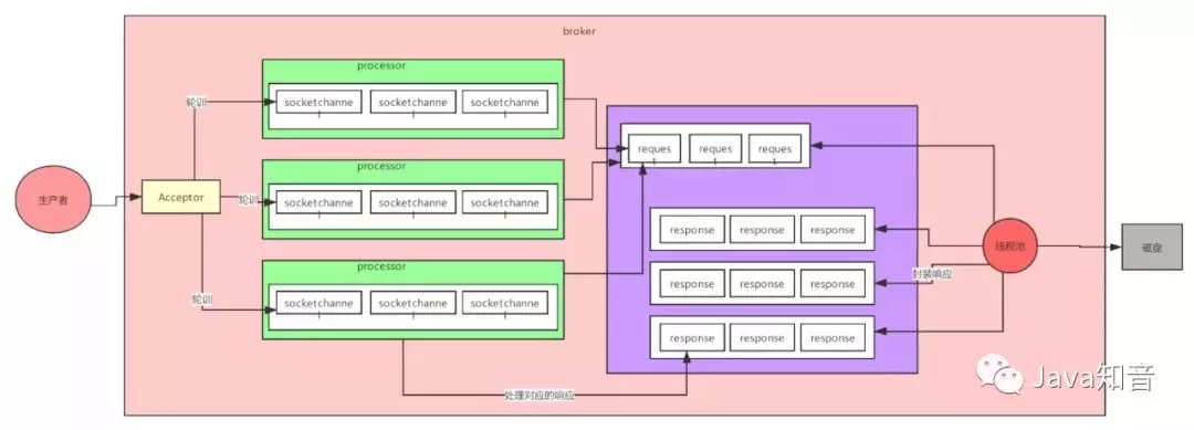 这个9936472之类的数字,就是代表了这个日志段文件里包含的起始offset,也就说明这个分区里至少都写入了接近1000万条数据了。 Kafka broker有一个参数,log.segment.bytes,限定了每个日志段文件的大小,最大就是1GB,一个日志段文件满了,就自动开一个新的日志段文件来写入,避免单个文件过大,影响文件的读写性能,这个过程叫做log rolling,正在被写入的那个日志段文件,叫做active log segment。 如果大家有看前面的两篇有关于HDFS的文章时,就会发现NameNode的edits log也会做出限制,所以这些框架都是会考虑到这些问题。 3.Kafka的网络设计kafka的网络设计和Kafka的调优有关,这也是为什么它能支持高并发的原因 首先客户端发送请求全部会先发送给一个Acceptor,broker里面会存在3个线程(默认是3个),这3个线程都是叫做processor,Acceptor不会对客户端的请求做任何的处理,直接封装成一个个socketChannel发送给这些processor形成一个队列,发送的方式是轮询,就是先给第一个processor发送,然后再给第二个,第三个,然后又回到第一个。消费者线程去消费这些socketChannel时,会获取一个个request请求,这些request请求中就会伴随着数据。 线程池里面默认有8个线程,这些线程是用来处理request的,解析请求,如果request是写请求,就写到磁盘里。读的话返回结果。 processor会从response中读取响应数据,然后再返回给客户端。这就是Kafka的网络三层架构。 所以如果我们需要对kafka进行增强调优,增加processor并增加线程池里面的处理线程,就可以达到效果。request和response那一块部分其实就是起到了一个缓存的效果,是考虑到processor们生成请求太快,线程数不够不能及时处理的问题。 所以这就是一个加强版的reactor网络线程模型。 finally集群的搭建会再找时间去提及。这一篇简单地从角色到一些设计的方面讲述了Kafka的一些基础,在之后的更新中会继续逐步推进,进行更加深入浅出的讲解。