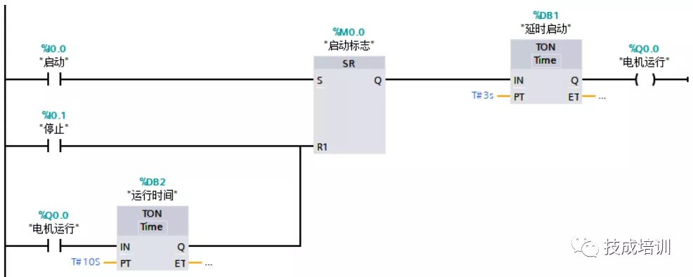 【示例】按下启动按钮,电机延时3秒后启动运行,运行5秒后电机自动停止运行。