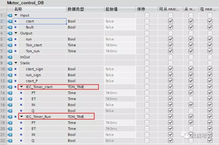 打开背景DB1,可查看到在该DB块中存放于FB块的接口区的各参数,在Static的接口区中就存放了定时器的背景DB相关的数据。